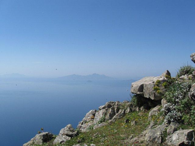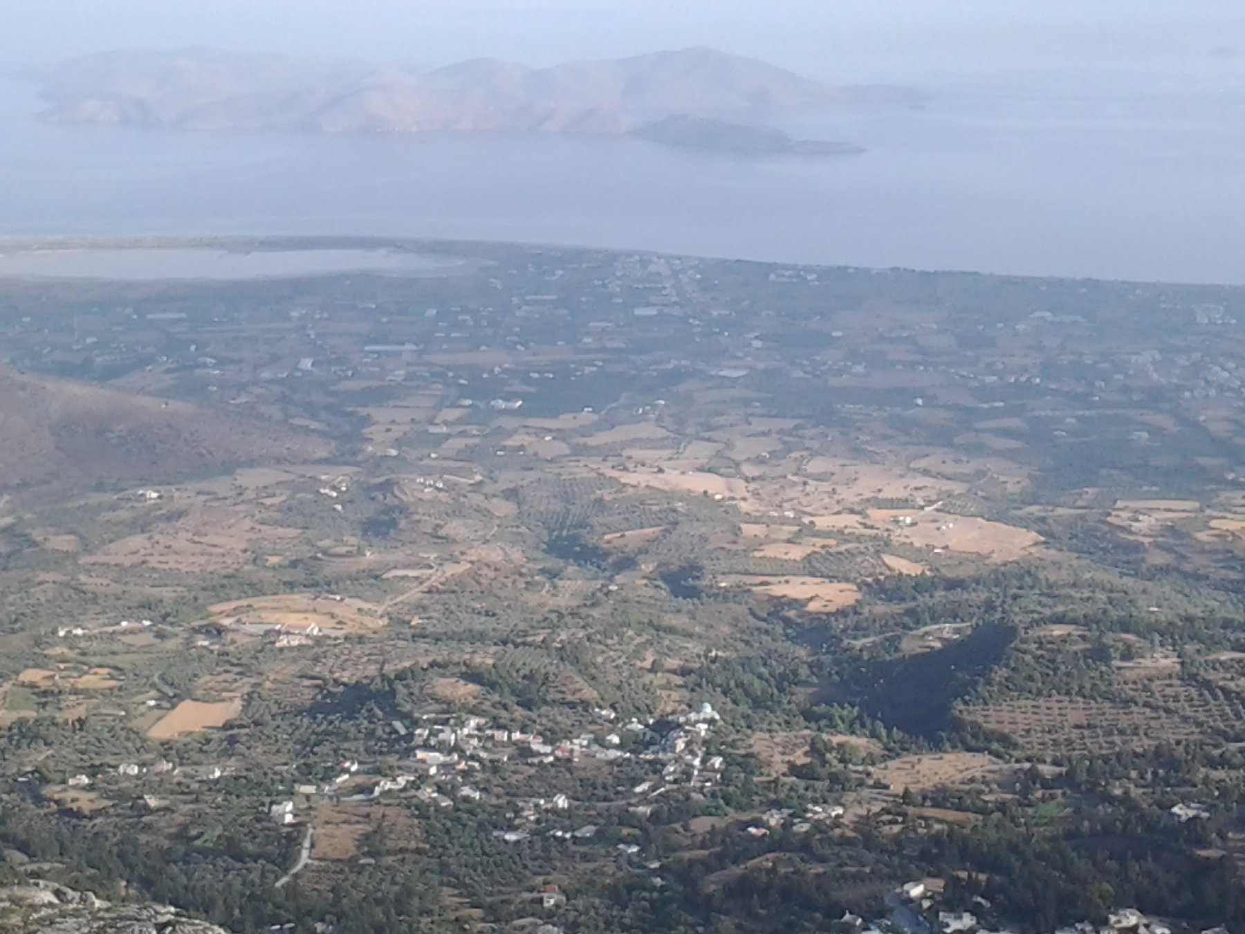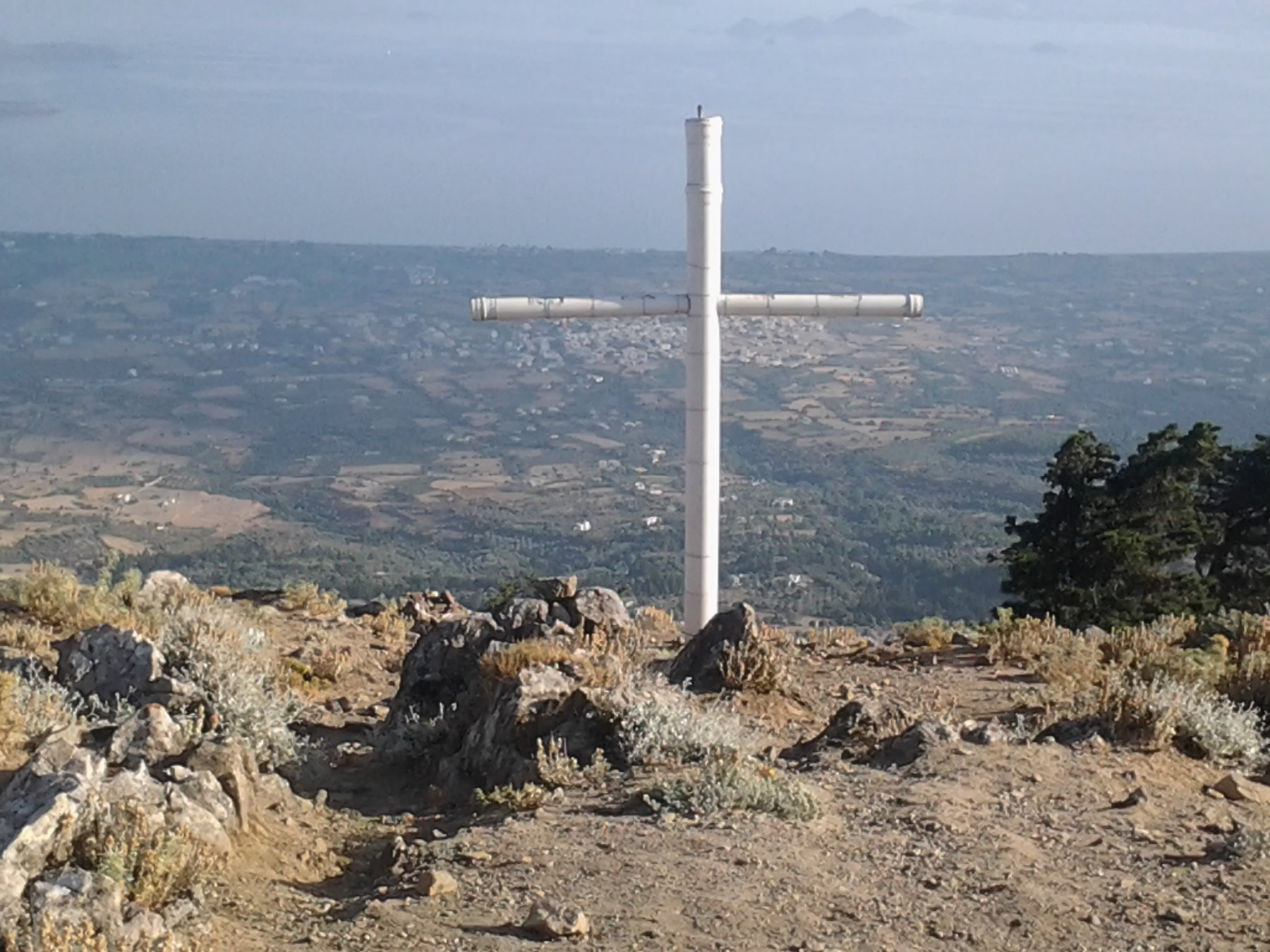 Inizia una bella mulattiera che si alza rapidamente molto panoramica verso l’isola di Kalimnos. Superato un canalino roccioso, si arriva su un ampia sella prativa luogo abituale di greggi. Il sentiero dopo un lungo traverso arriva al bivacco e alla chiesetta appena sotto la cima.