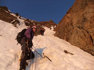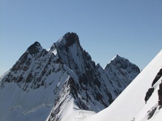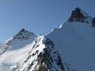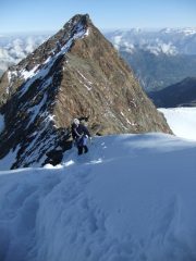 Partiti dalla Mischabelhutte (rifugio carissimo senza acqua e bagni chiusi…) alle 2:45, siamo saliti al windjoch e poi ridiscesi per circa 300 mt sul riedglacier fino all’attacco del canale del Dirrujoch. Canale in buone condizioni, risalito completamente senza toccare le rocce tutto su neve dura, poi al colle proseguito fino al Dirrunhorn lungo la facile cresta. Tornati indietro al colle abbiamo proseguito lungo la bellissima cresta in ottime condizioni fino al Nadelhorn attraversando prima l’Hohberghorn e poi lo Steknadelhorn.