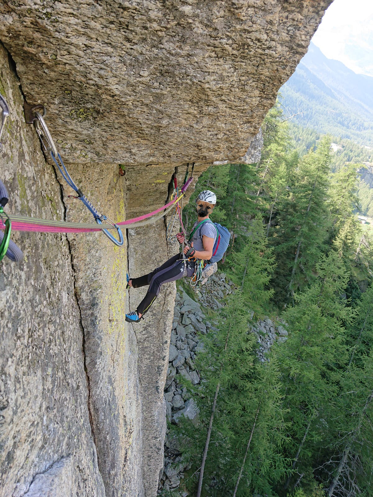 Simbolica e divertente, anche se il tiro duro impegna per bene, e pure il diedro prima del tetto bisogna sudarselo! Doppi 0.5 e 0.75 per l’artificiale, meglio tripli, soprattutto se si impiegano già prima del tetto. Il lamone sopra la S1 sembra sfidare le leggi della fisica per rimanere lì, ma non c’è proprio modo di evitarlo, meglio mettersi un po’ a dieta ed essere delicati… Il resto della via è molto godibile, varia e piacevole