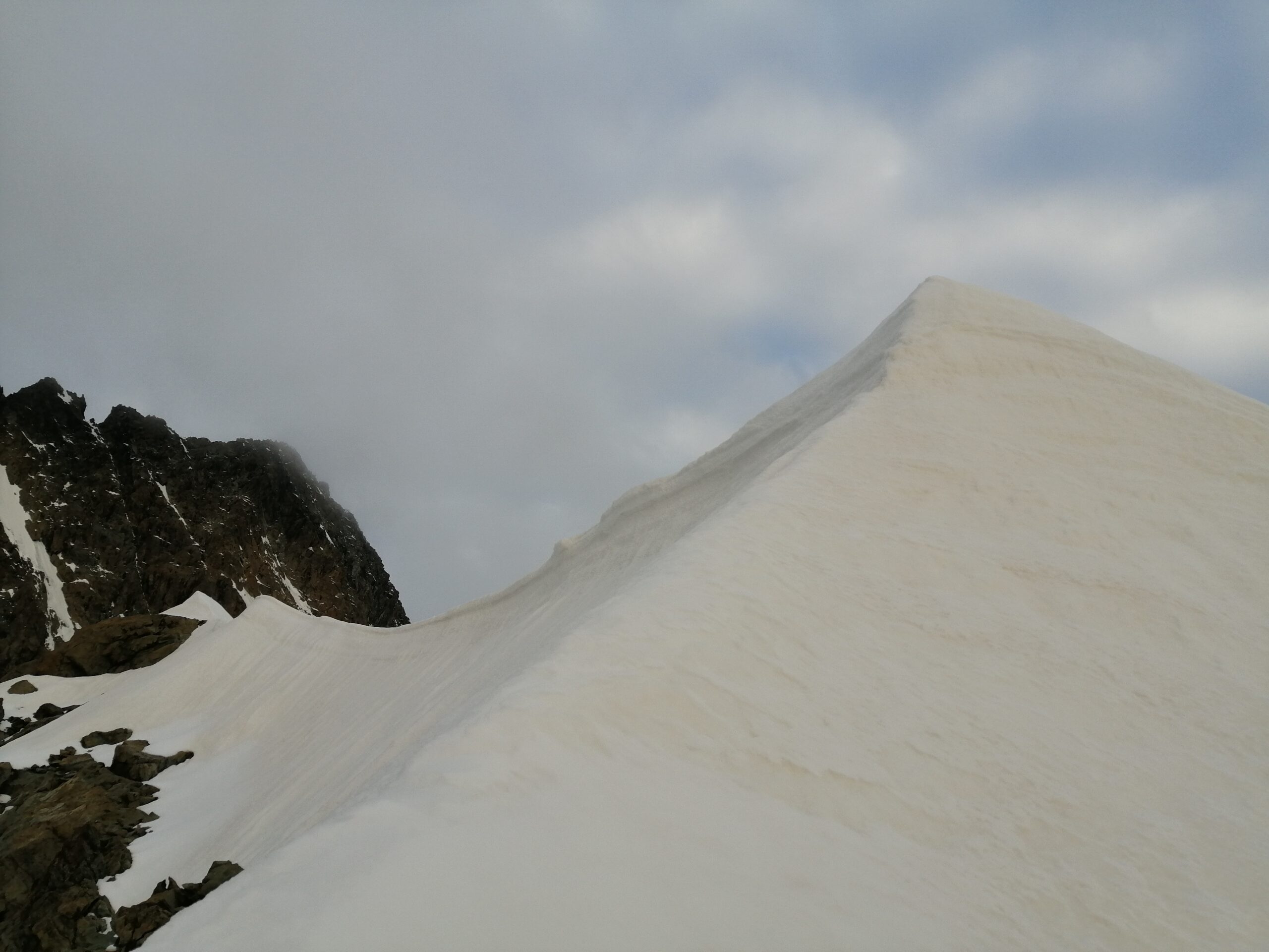 Eravamo 2 cordate e siamo scesi insieme seguendo il ghiacciaio e tenendo la dx, fino a raggiungere ‘il buco’ ovvero il crepaccio terminale (ora quasi completamente chiuso, sembra un buco). Lasciandolo sulla nostra dx, abbiamo traversato sotto la crepaccia verso dx e siamo giunti a un punto in cui c’erano 2 canali: uno, più stretto e ripido, scendeva verso dx (appena sotto le rocce) e l’altro, più largo, proseguiva verso sx. Qui ci siamo divisi e la strada giusta era la loro: bisogna scendere verso sx per poi curvare decisamente a dx più in basso (sotto la bastionata di roccia)… Insomma, fare una S.