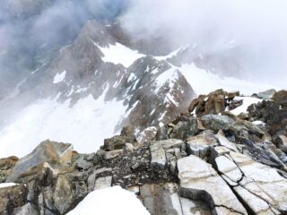 Siamo scesi dalla cima con le doppie fino al ghiacciaio del Ventina, che è del tutto irriconoscibile rispetto ai miei ricordi, neppure tanto lontani… comunque un passaggio si trova, provo a riassumere: noi dal bacino sommitale del ghiacciaio siamo scesi tutto a destra a una zona di pendii e roccette, da qui tutto a sinistra su una specie di ampia rampa/cengia nevosa che poi diventa un pendio che scende a fianco della grande seraccata alta; poi di nuovo tutto a destra su un ripiano non ben visibile dal basso che porta sopra la più piccola seraccata inferiore; infine traversando verso destra sopra di questa, raggiungendo per facili pendii il bacino glaciale in fondo.