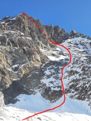 Allestire una sosta e fare un tiro di circa 30mt di III° risalendo un bel diedro, segue un secondo tiro di 40mt, partenza atletica poi neve e ghiaccio.