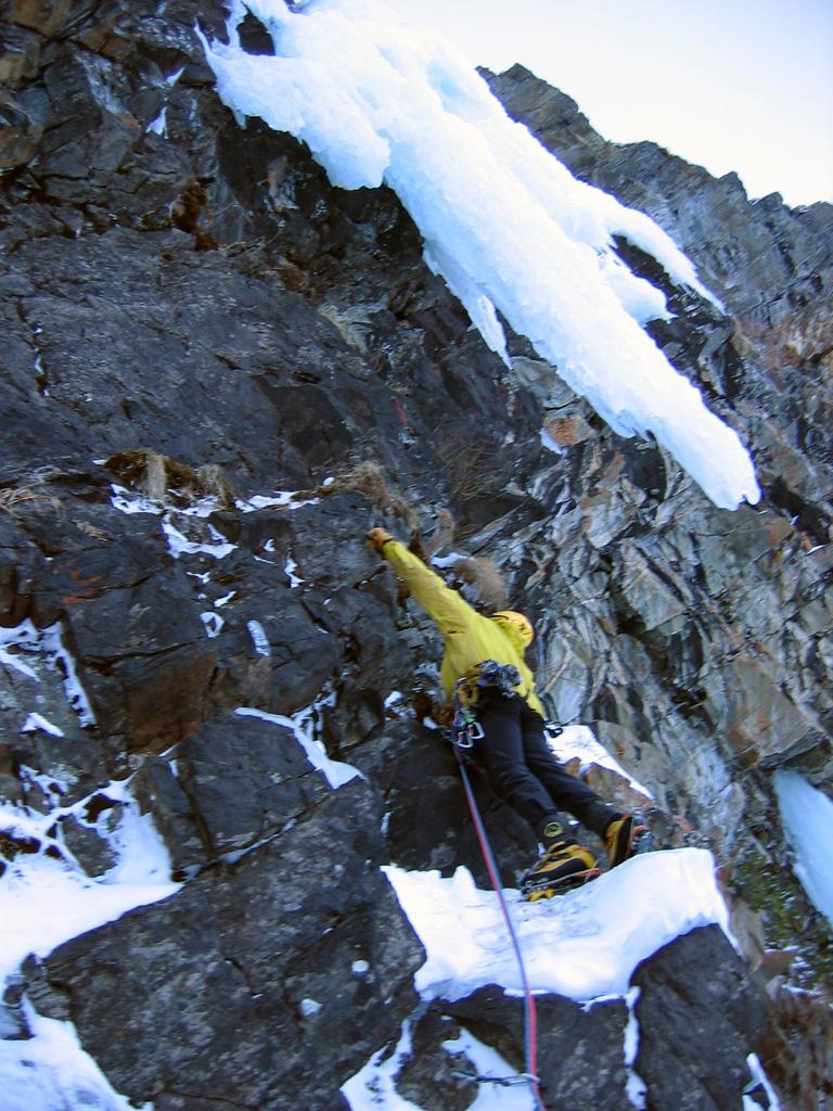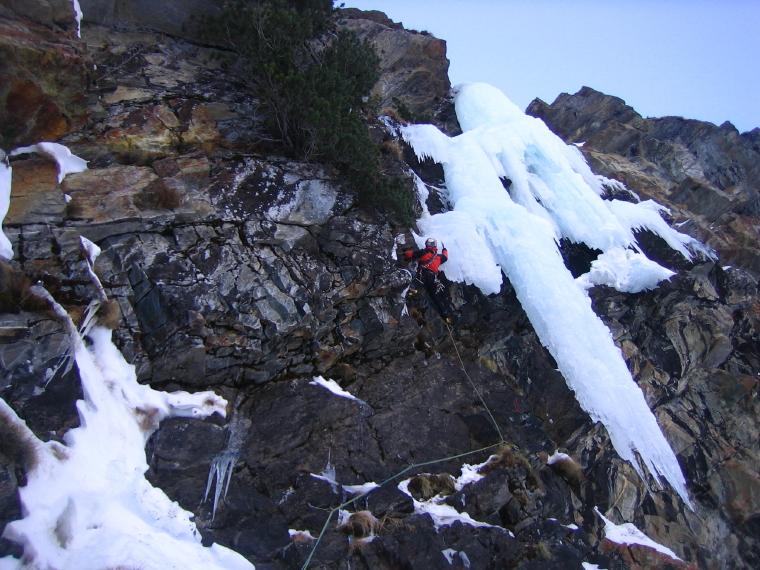 L1-se la candela non tocca c’è una partenza attrezzata a spit su roccia(M6/7?)per 10/15 metri,dipende come si forma la candela,sosta a sx su spit e chiodo(vecchi).