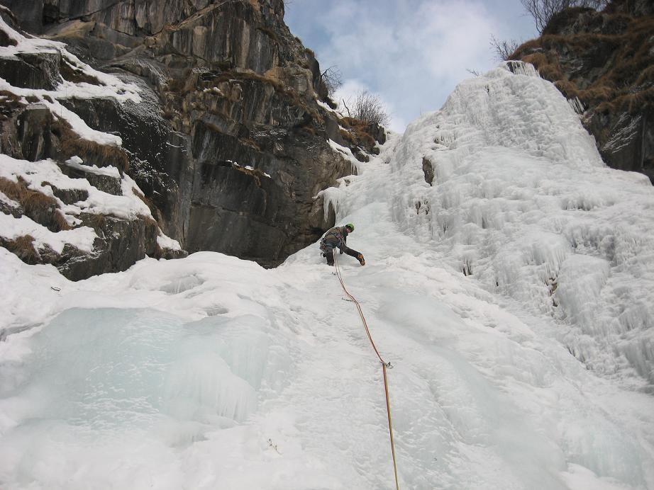 Cascatone piacevole mai impegnativo se non per le condizioni del ghiaccio che vista quota ed esposizione si presenta in parte vetroso anche se in basso si sono trovate colate porose.