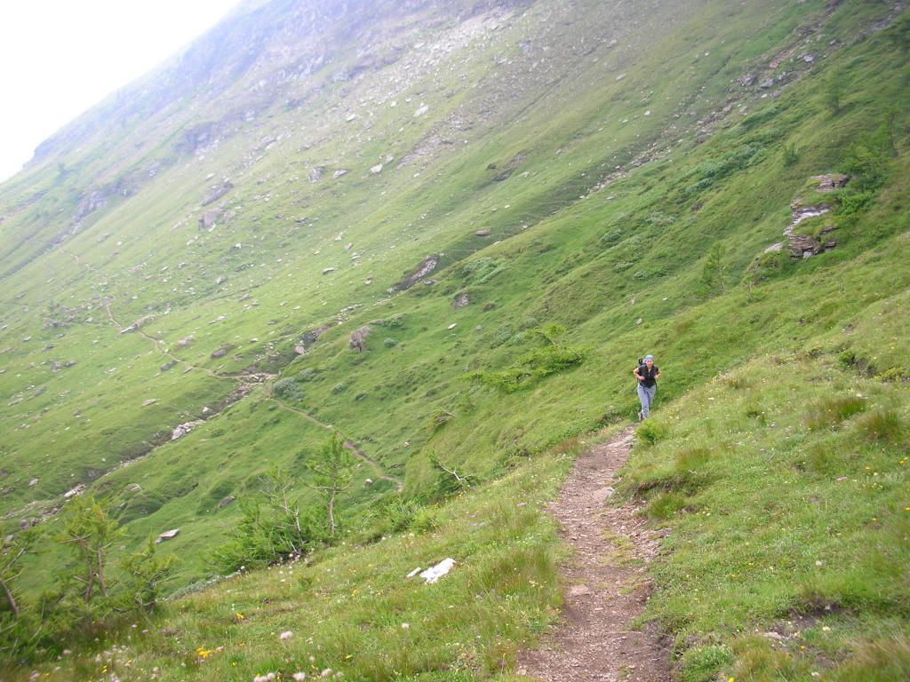 Abbiamo approfittato dell’apertura della funivia (era ora!!) e siamo partiti di lì. Circa 50 m dopo l’arrivo della funivia c’è un cartello che segnala il sentiero 5C e indica 2h30’ per Dondena: è sballato in pieno, esagerando ci vuole 1h15’-1h30’. Da quando si lasciano le piste il sentiero è molto bello (e deserto). A Dondena abbiamo trovato un simpatico e serafico asinello. Al rientro abbiamo attraversato 2 o 3 grupponi di mucche al pascolo. Purtroppo le migliaia di fragoline di Scaletta non sono ancora mature.