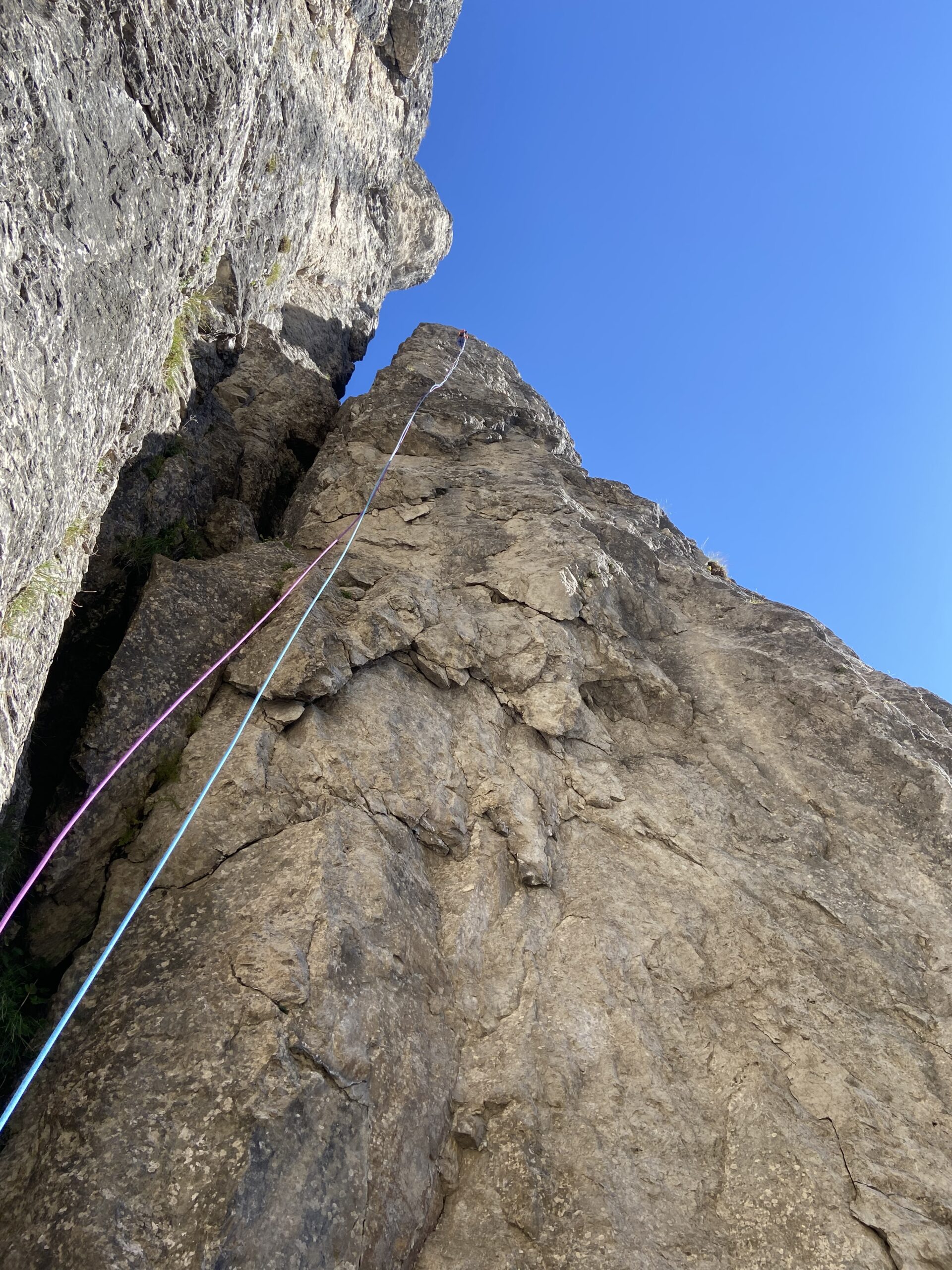 L5-Ultimo tiro che supera un primo muro faticoso con poche ma buone prese e conduce poi per rocce più facili alla croce di vetta.