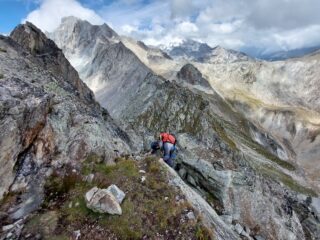 Bella cavalcata au delà des nôtres Alpes. Primo tratto di cresta molto semplice anche se abbastanza esposto, lisce ed abbattute placche con sufficienti appigli ed appoggi fino a oltre 2800 m. Segue poi divertente tratto in cresta, svolto in conserva, possibilità di proteggersi a friend (fino al 2 bd) e fettucce. Sempre seguito il filo fino alla vetta, roccia solidissima. Dalla cima, calata circa 30 m (avevamo una corda da 60 m), poi risaliti verso il filo di cresta per un breve traverso e tratto di disarrampicata esposto fino alla sosta successiva, possibilità di assicurarsi su maillon ben visibile sul traverso. Nuova calata per poi proseguire per facili roccette fino allo spigolo esposto attrezzato con 3 spit. Dalla sosta, anziché calarci abbiamo proseguito sulla cresta successiva (facile ma esposto). Da qui due possibilità: come da relazione, tenere la destra (Est) per reperire le cenge esposte, di facile individuazione per tanti e begli ometti; in alternativa, proseguire fino a dove la cresta comincia a scendere, è presente una sosta che dovrebbe permettere una calata agevole fin dove le cenge risultano meno esposte (vedere foto). Noi abbiamo optato per la prima, in quanto non eravamo sicuri bastassero 30 metri di corda e si arriva disarrampicando con grande esposizione sotto al c. Arrivati al colletto, proseguire ancora per facili roccette fino a reperire un ometto che segna l’inizio del comodo sentiero di rientro.