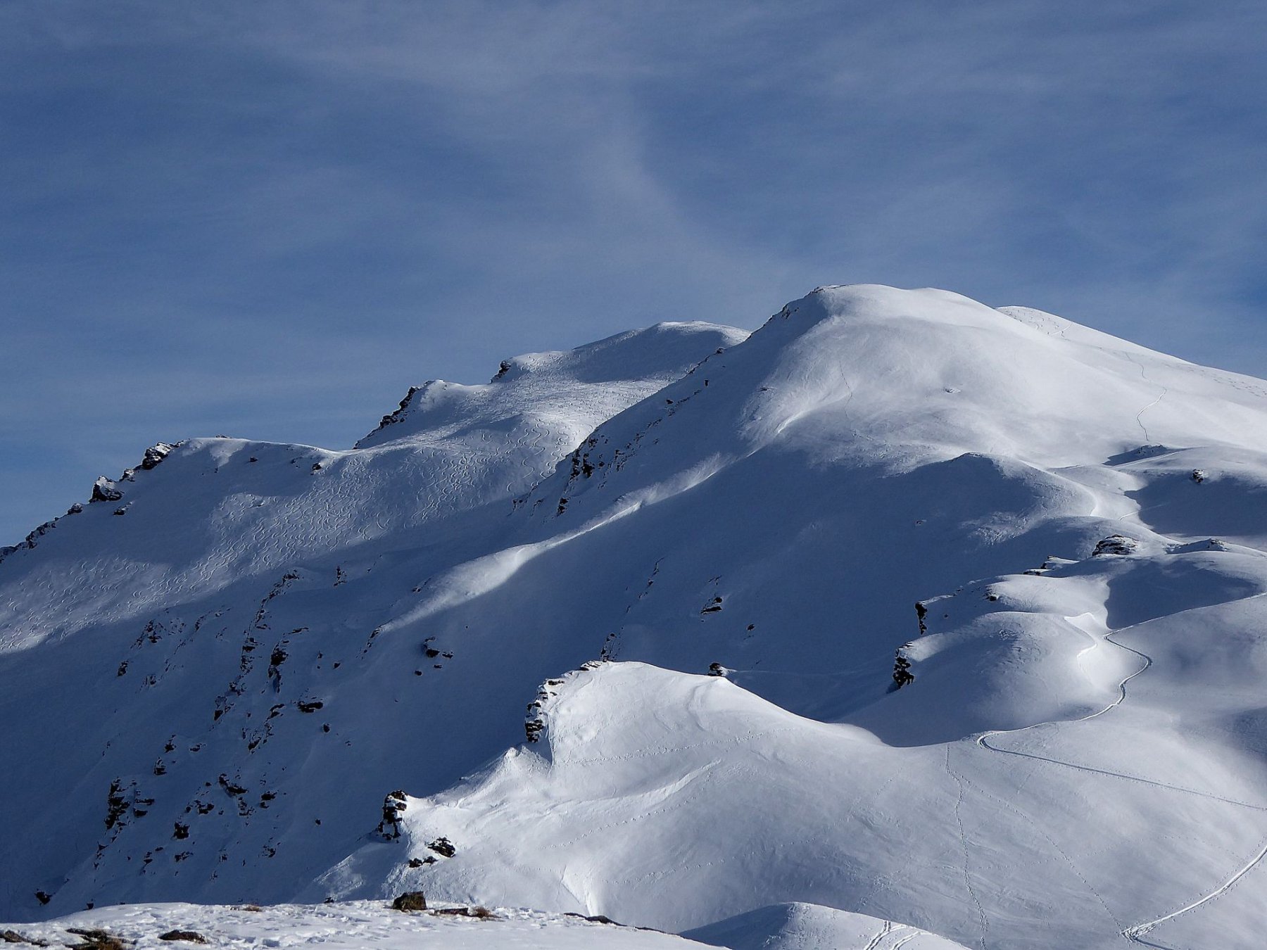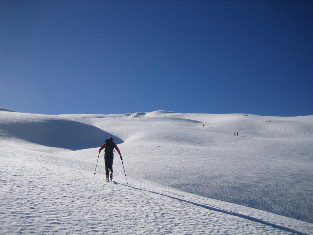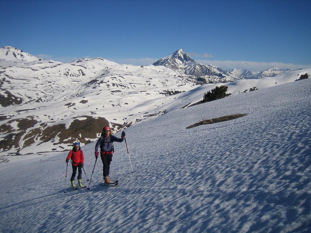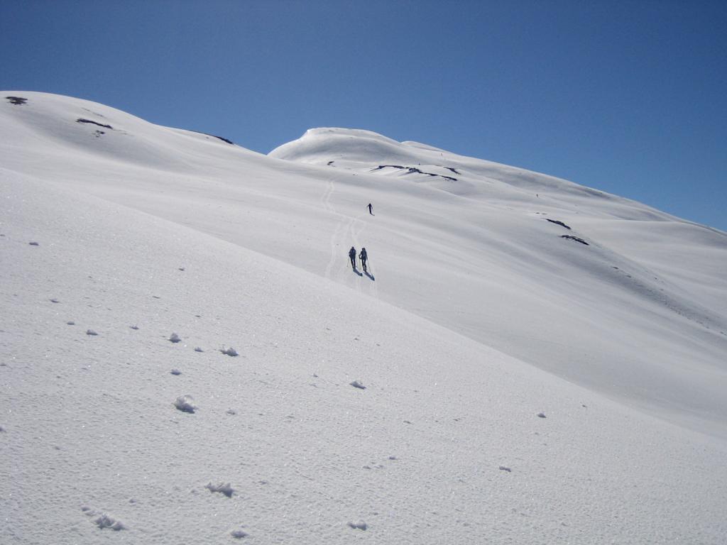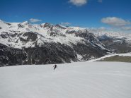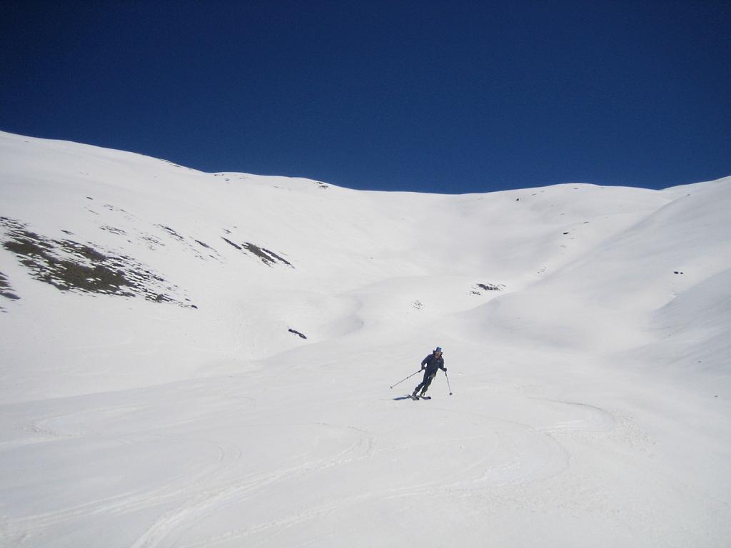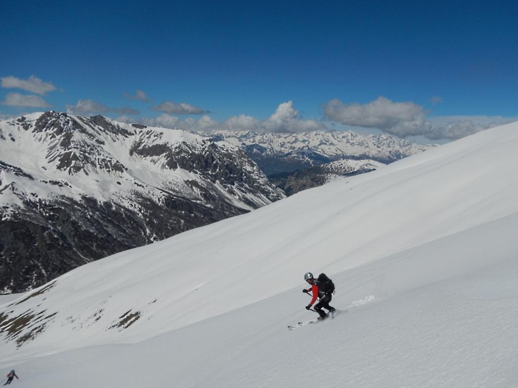 Possibile proseguire fino alla cima 2944 e scendere su Les Fonds, oppure fermarsi alla prima cima 2708 e scendere dall'itinerario di salita sui pendii esposti a NW con neve spesso fresca