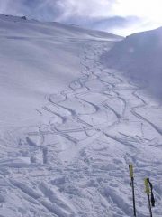 Una bellissima giornata di sole, solo qualche velatura, mai particolarmente fredda . Abbiamo aperto la traccia da Chabaud in su senza troppi problemi, neve assestata. DIscesa da favola a mio parere fino a quota 2000, poi crosta non portante su aghi di pino, comunque una giornata emozionante, siamo al 15 Novembre!!! Un saluto ai miei compagni di gita (autori della foto tra l’altro)