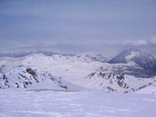 La superficie del manto, che sui primi pendii sopra Rhuilles comincia a sparire, è irregolare -sopratutto nella parte alta- per effetto del vento. Sul versante nord proprio sotto la cresta è caduta (da una decina di giorni circa) una valanga a lastroni con un fronte di un centinaio di metri. la temperatura si è mantenuta sotto lo zero per tutta la mattinata e ha continuato a sfiocchettare leggermente: i grandi spazi del vallone sono stati come al solito profondamente appaganti.