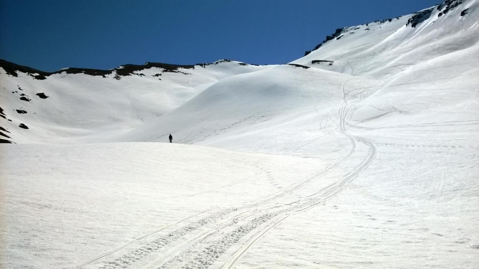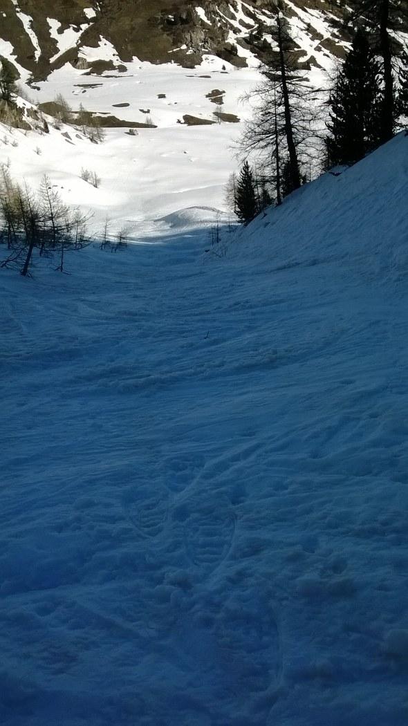 Partito per fare il Giassez seguendo la stradina che costringe a parecchi gava buta,innevamento continuo da Chabaud,ma una volta fatto il ripido canale e constatato che le condizioni non erano proprio il massimo(pendii raccordati ma copertura non continua)deviato rapidamente verso la Dormillouse raggiungendo un gruppo di skialp davanti a me.