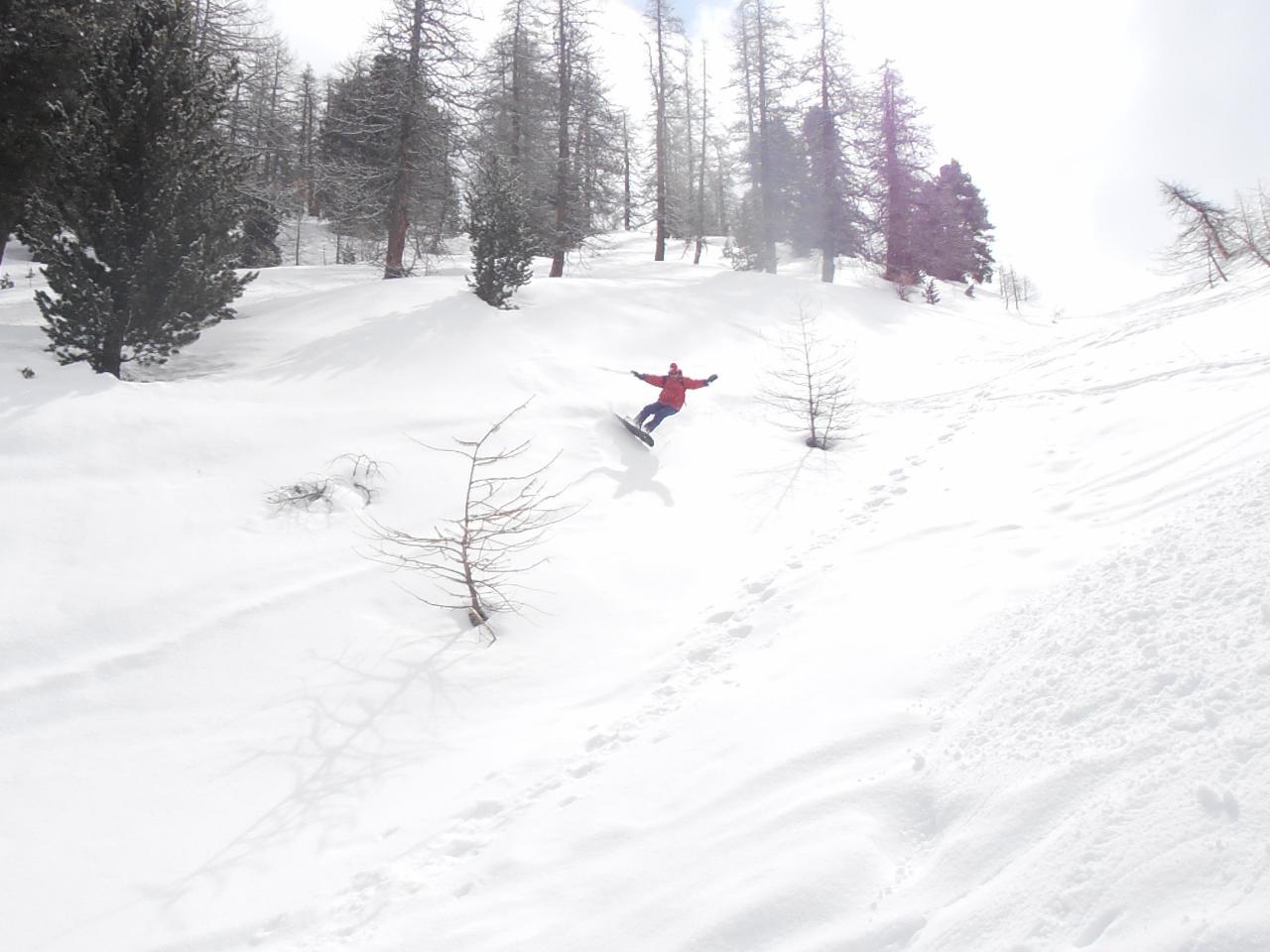 Arrivati fino a quota 2450, ingresso del magnifico vallone che porta alla Dormilleuse. Tutta la salita sotto la nevicata e con scarsa visibilità, meno male che c’era un veloce terzetto di scialpinisti che ci ha lasciato una traccia sulla neve per orientarci. Incontrati mentre scendevano, ci hanno detto di aver desistito causa visibilità nulla, ma noi abbiamo avuto la fortuna di arrivare al loro punto di arrivo con un improvviso squarcio di cielo sereno e vedere il panorama; era comunque troppo tardi per arrivare in cima (Il trio di veloci skialp, con l’avvento del bel tempo, è invece risalito “al volo”sul Giassez). Discesa con inizio alle 11:45, Dai 2450 ai 2300 circa crosta poco portante coperta da due dita di neve fresca ed umida. Parte mediana tutta su neve primaverile con una spolverata di neve fresca (umida) sopra. Sotto la chiesetta di Grange Chabaud la neve fresca era già scomparsa e si arriva fino a Rhuilles per lingue di neve, buona, trasformata.