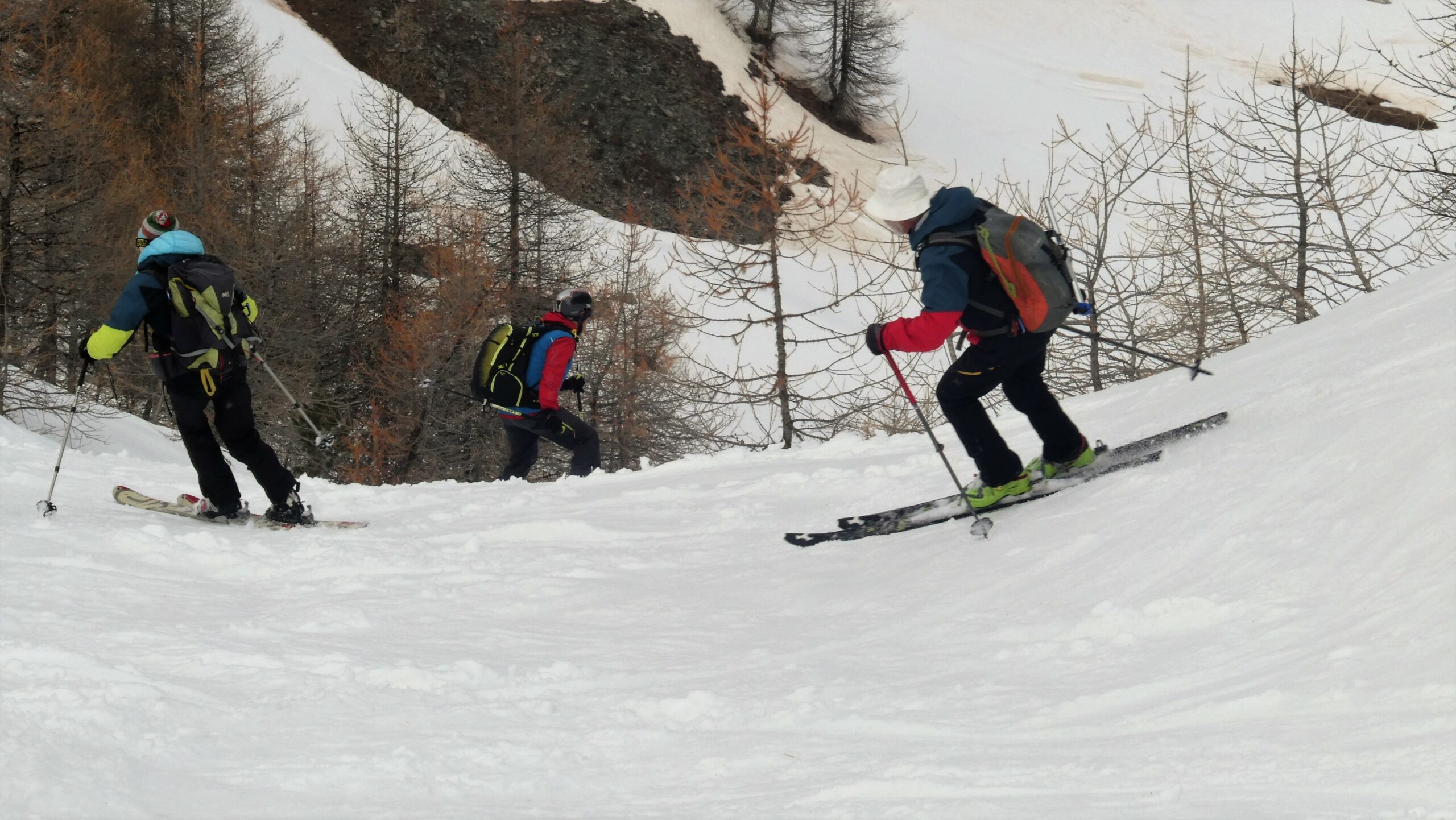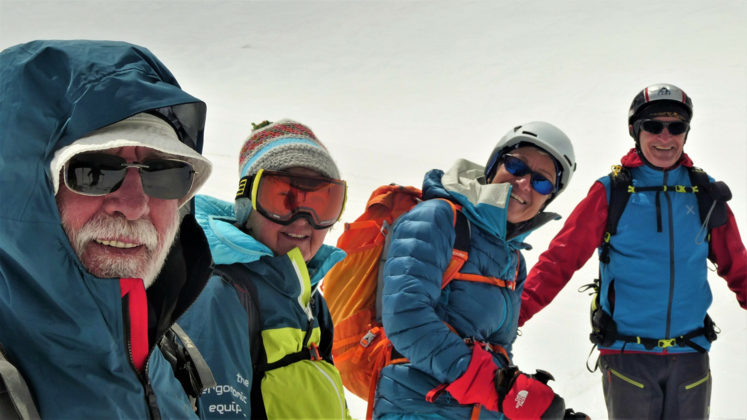 Accolti da una discreta tormenta dopo breve portage calziamo gli sci che togliamo dopo poco per breve tratto, poi bella neve sino in cima passando per pendii a sin. salendo un paio di tranquilli canali che si congiungono alla traccia normale verso i 2500 m.; prima parte della discesa su neve piuttosto gessosa tra folate di vento e nuvole a chiaro-scuro, poi bella trasformata e morbida sino in fondo
