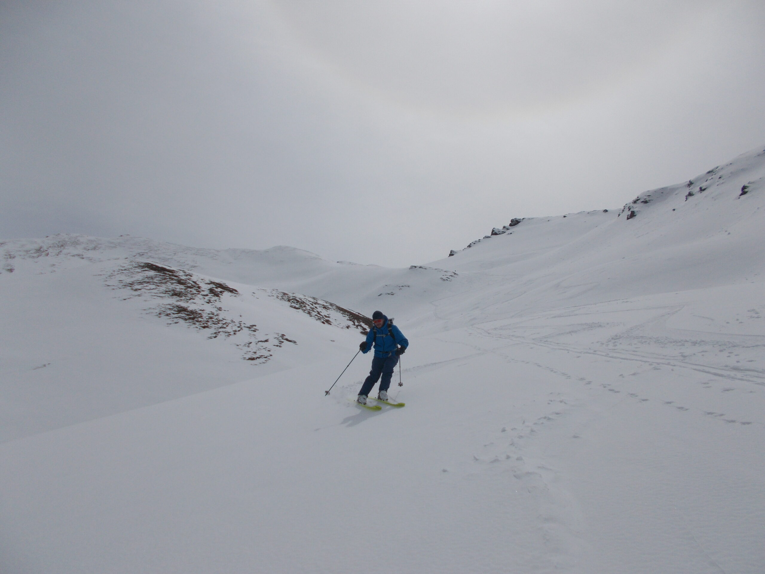 Portage fino a poco dopo il ponte oltre le grange Chabaud, neve continua dal pianoro 2100 m., prima numerose interruzioni. Da lì in su ottimo firn con due dita di farinella recente, ultimi 100 m. sotto la cima 10 cm. di neve farinosa compatta, a tratti resa crostosa dal vento. 800 m. di ottima discesa, poi gava e buta e portage.