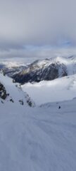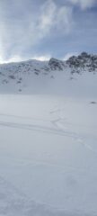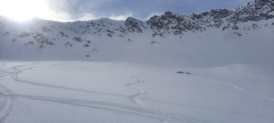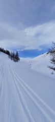 Raggiunto il pianoro sottostante si prosegue in direzione del Colletto Clausis; di qui in poi la neve è tutta tritata e, complice aumento della pendenza, si prosegue in maniera piu’ controllata.