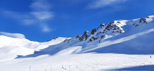 Discesa sul vallone principale, ma stando in alto e scendendo dai canali sulla sinistra in ombra su polvere pesante molto sciabile e divertente.
