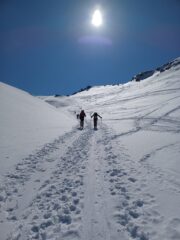 Partiti da Rhuilles sci in spalla. Neve costante dalle prime borgate. Arrivati al primo canale inizia ad esserci neve farinosa che prosegue fino in cima.