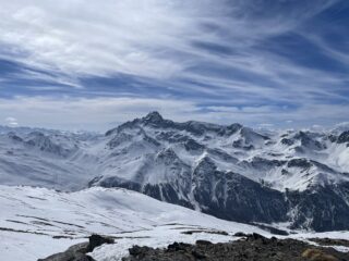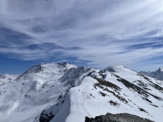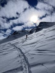 Entrati nell’ampio vallone che porta verso la vetta abbiamo imboccato il primo canale destro a quota 2400 battendo traccia. Arrivati in cresta l’abbiamo seguita tutta fino alla cima con qualche tratto spoglio.