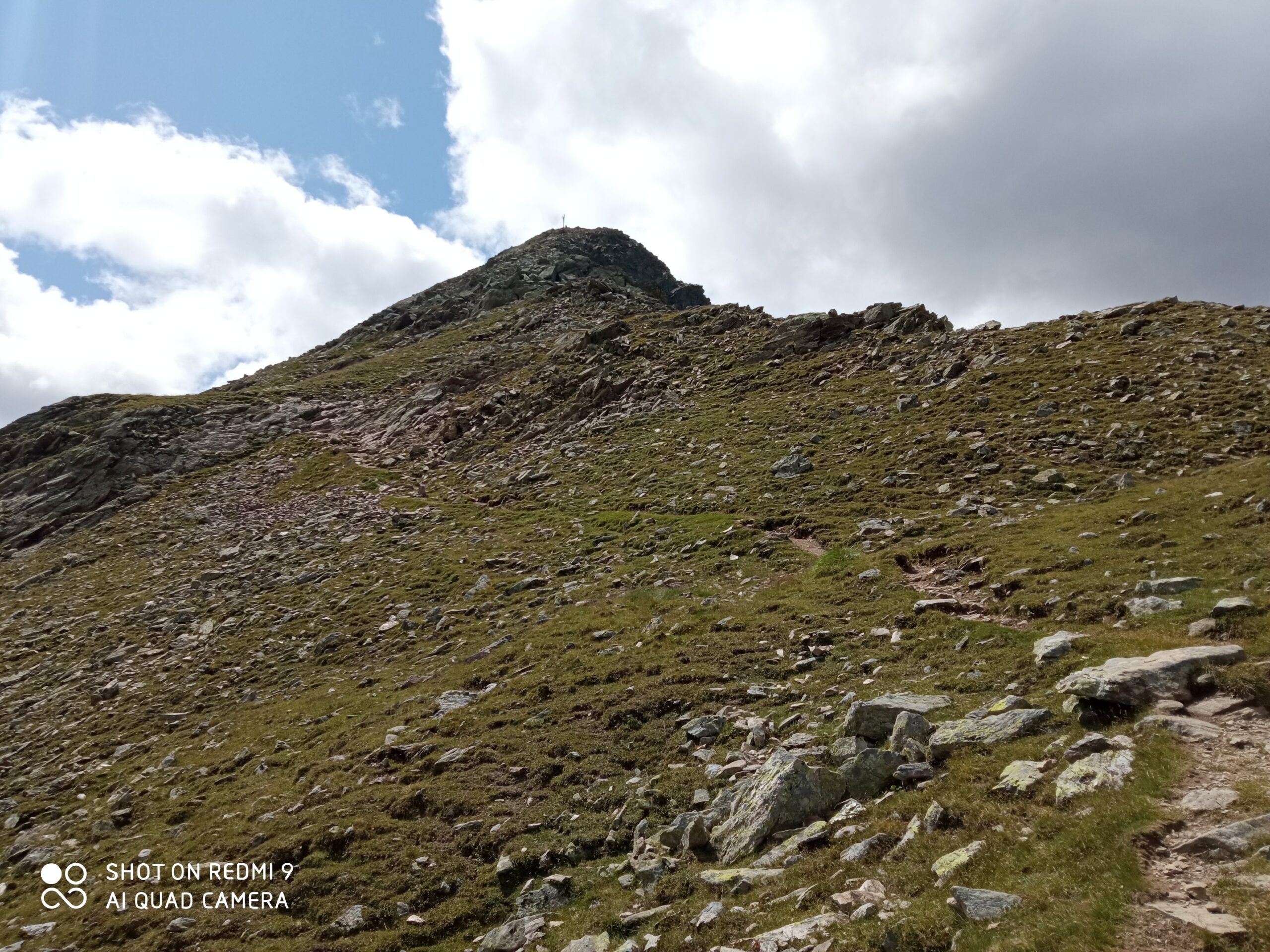 Dal parcheggio si percorre il muro della diga, giunti dalla parte opposta si trovano i cartelli coi vari sentieri. Si sale a sinistra seguendo il 17. Il sentiero sale nel bosco con buona pendenza e brevi tratti più piani fino a poco sopra la malga del bosco dove si passa per una prima breve radura. Si rientra nel bosco fino ad altra stretta radura che si risale quasi nel centro di un canale per un breve tratto per poi deviare a destra di nuovo nel bosco. Il sentiero è sempre ben marcato e incroci con altri sentieri sono sempre segnalati da cartelli. Circa a quota 2300m si esce dal bosco e si va a raggiungere la sommità del dosso boschivo appena risalito e che sovrasta il lago di Vernago. In questo punto si trova la deviazione verso sud per il Nock. Un grosso ometto, visibile anche da valle, segna il punto panoramico verso il lago e l’alta Val Senales (evitare di sporgersi troppo). Si devia quindi verso sud, il terreno ora a tratti diventa più pietroso ma si procede sempre su traccia ben marcata e segnata da bolli b/r. Si risalgono zone di pascolo, la croce di vetta è ormai ben visibile, ci si sposta verso destra con quella che sembra essere una breve divagazione ma è solo per evitare dei bassi rilievi pietrosi generalmente pascolati da pecore, e si arriva sotto l’apparentemente rocciosa cuspide sommitale che si risale invece facilmente su traccia e pochi passi su pietre fino all’erbosa vetta.