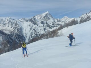 Neve bella in alto, poi polenta sciabile, infine nel bosco da dimenticare. Salita da battete, faticosa. Arrivati a 70 m dalla cima, poi era neve inconsistente e non valeva la salita