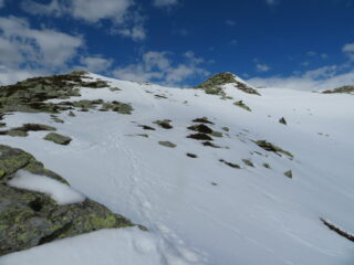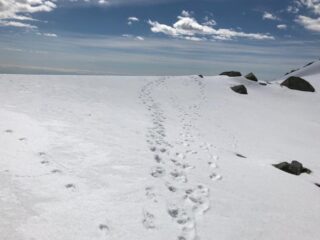 Neve solo quando si sbuca sul pianoro verso la vetta, sfondosa e abbondante, ma già marcata da umani.