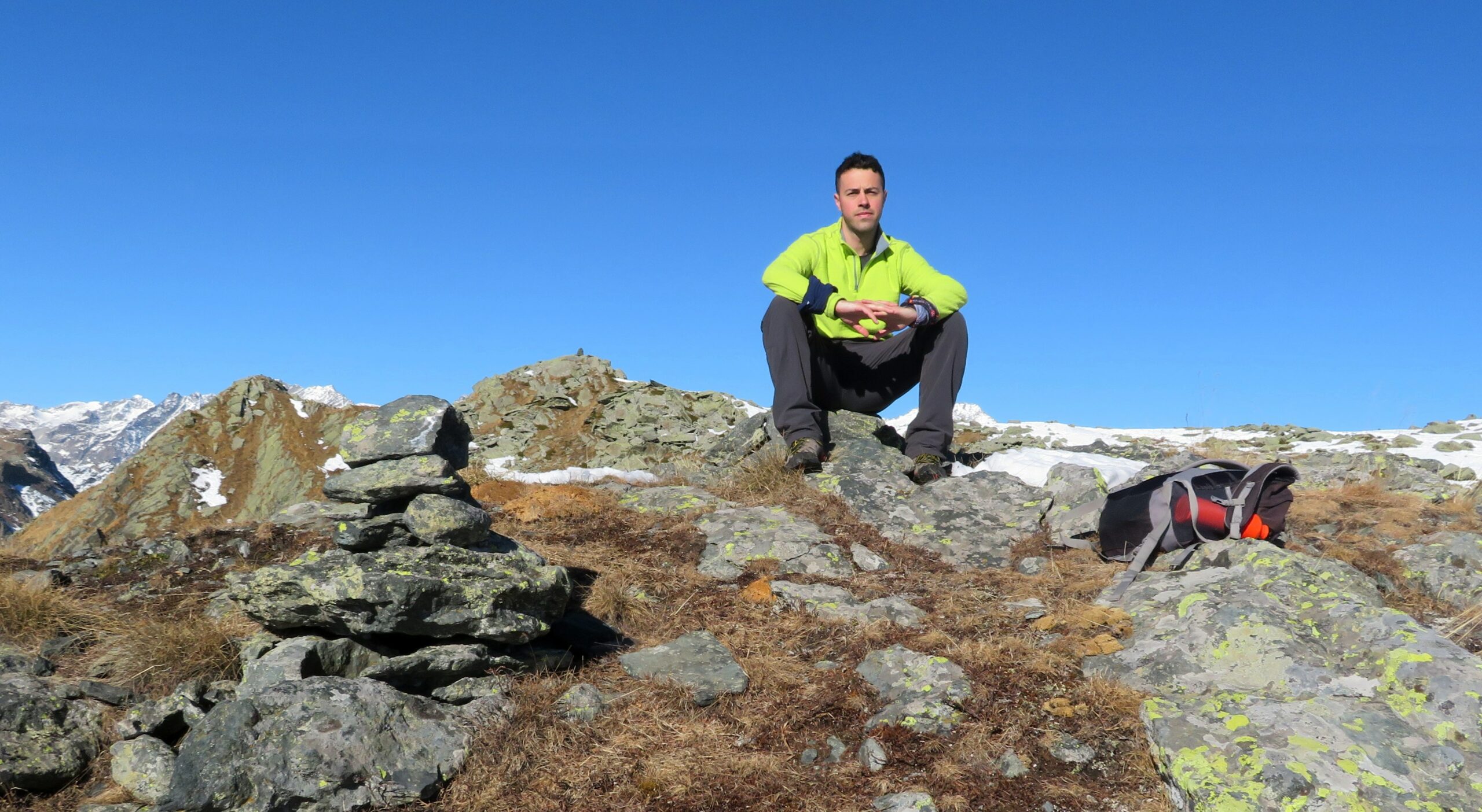 Dal colle al falsopiano tutto pulito e senza neve. Siamo saliti prima sull’anticima (poco innevata), quindi su neve portante senza usare i ramponcini fino alla vetta. Oggi in ottima compagnia di Emanuel.