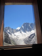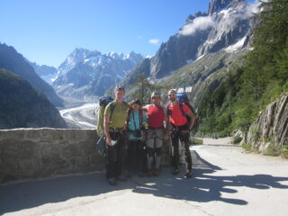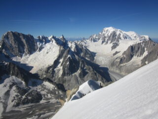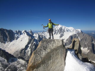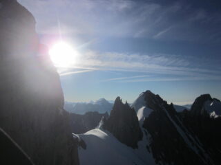 Finalmente un agognato 400(1), superba salita in ambiente selvaggio e lontano, con notevole dislivello ,scale a scendere dal trenino x mettere piede sul ghiacciaio, poi dopo averne percorso un bel po , risalita di altre scale x accedere al rif couvercle(chiuso), tutto sommato 3 h , e poi x scelta e visto che il canale d’accesso alle droites a vista era bello secco , passiamo al piano B, allungato di 1-30′ la meta, seguito pali gialli sotto il rif che portano a scendere sul ghiacciaio talefrè x andare a costruirci nostra piazzola sul pianoro sotto quasi la verticale della salita alla vetta, (bivaccato all’aperto con sacchi piuma e copri sacco , al top del confort)riposo pomeridiano, perlustrazione x la linea da prendere la notte , cena presto e nanna ore 20, sveglia sotto le stelle ore 1.00- colazione, ore 1-45 pronti via dritto x dritto a prendere la conoide principale con neve ben rigelata 40°-45°, poi scavalcato costola e ripreso pendio andando a sx- 45°-50° e nel mentre albeggia e siamo anche giusti, poi inizia la scalata su roccia (pessima), e nel mentre ci incasiniamo un po al dritto (forse non e giusto), nel mentre cerchiamo un varco piu facile compaiono 2 francesi arrivati dal canale (confermano che e ko)e da li noi scendiamo con una doppia x riprendere a salire nel punto piu debole fin ad arrivare all’unico pezzo Bello la crestina finale che e ancora bella lunga ed in breve in vetta (Fantastico bello panoramicissimo e freddo ) poi lasciamo il posto a foto e ad altro, h 9 circa. ma la tensione non deve mollare inizia solo adesso la gita doppie almeno una decina da 30 le prime poi da 60 le altre considerato che siam in 4 il tempo corre siamo alle 13 in pieno pendio.(ogni tanto qualche pietra da scioglimento neve e o corda in recupero se ne venivano giù) , disceso faccia a monte con neve parte alta un po delicata e man mano che si scende dritti x dritto migliora e la picca entra bene quindi rassicura, scesi sul conoide basale via via ci si poteva anche girare fin ad arrivare al base camp alle 15 .(ci siam solo legati su roccia e x le doppie il resto ognuno x se.)poi che fare il treno era a rischio dario ed alma cercano di riaffardellare tutto e schizzare via , io e luciano pur pronti rimaniamo indietro e quindi decidiamo x la calma . risultato (anno comunque perso il treno)io e luc. arriviamo alle 20 al montanvers , ci guadagniamo 2 h x chamonix in compagnia di altri!!, e a meta tragitto un oasi (lo chalet)dove non esitiamo x una birra. ore 22 all’ auto dai nostri soci, e poi a casa,x le 24-30′ (full immersion). grazie a tutti i partecipanti Alma-Dario-Luciano x la bella (gita fatica)BEL 4001 E LE VIE NORMALI NON SON PIù (NORMALI!!!)