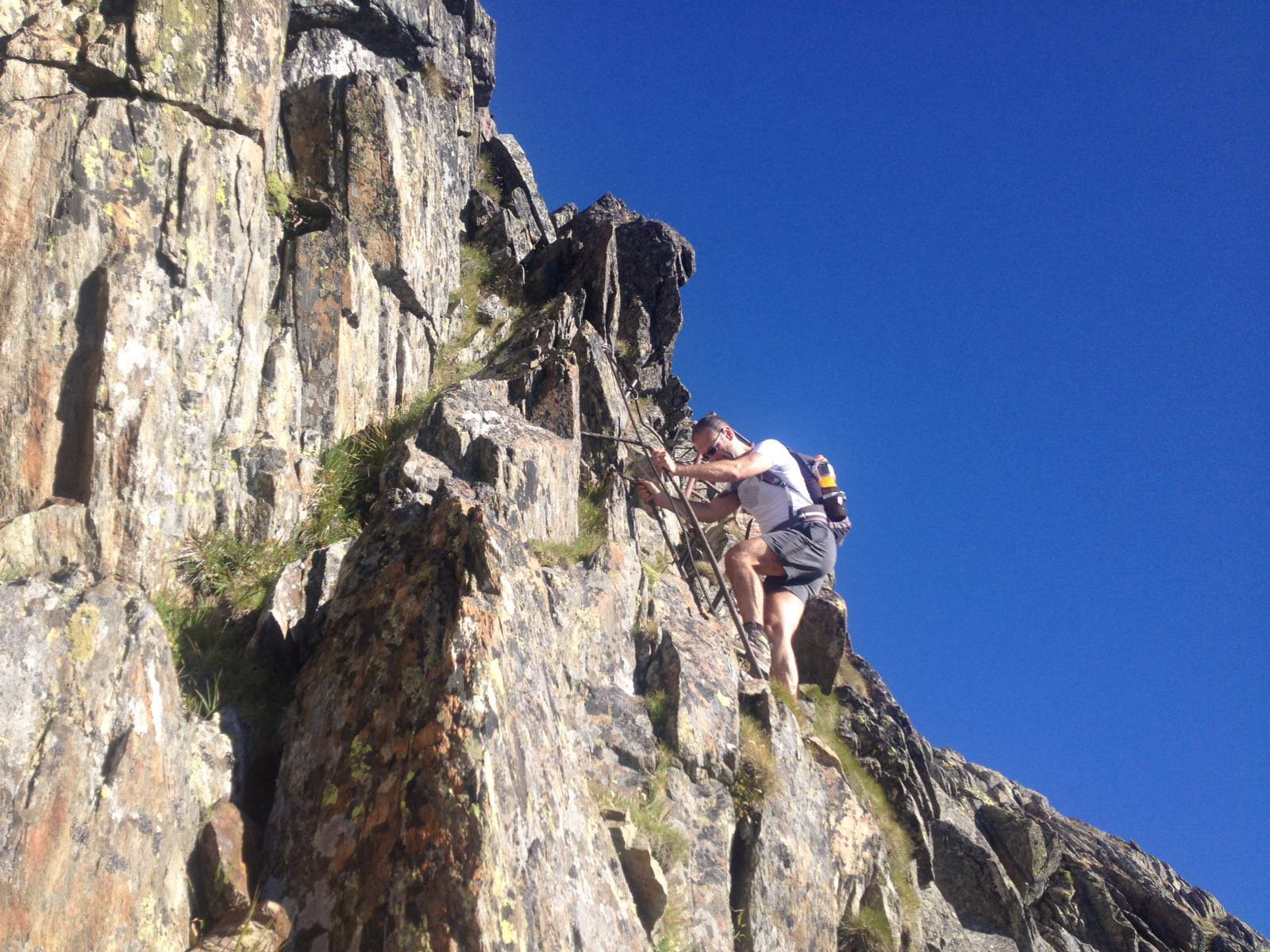 La discesa con alcuni passaggi di I grado è facilitata da catene e scalette metalliche.