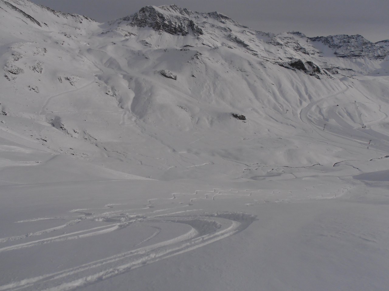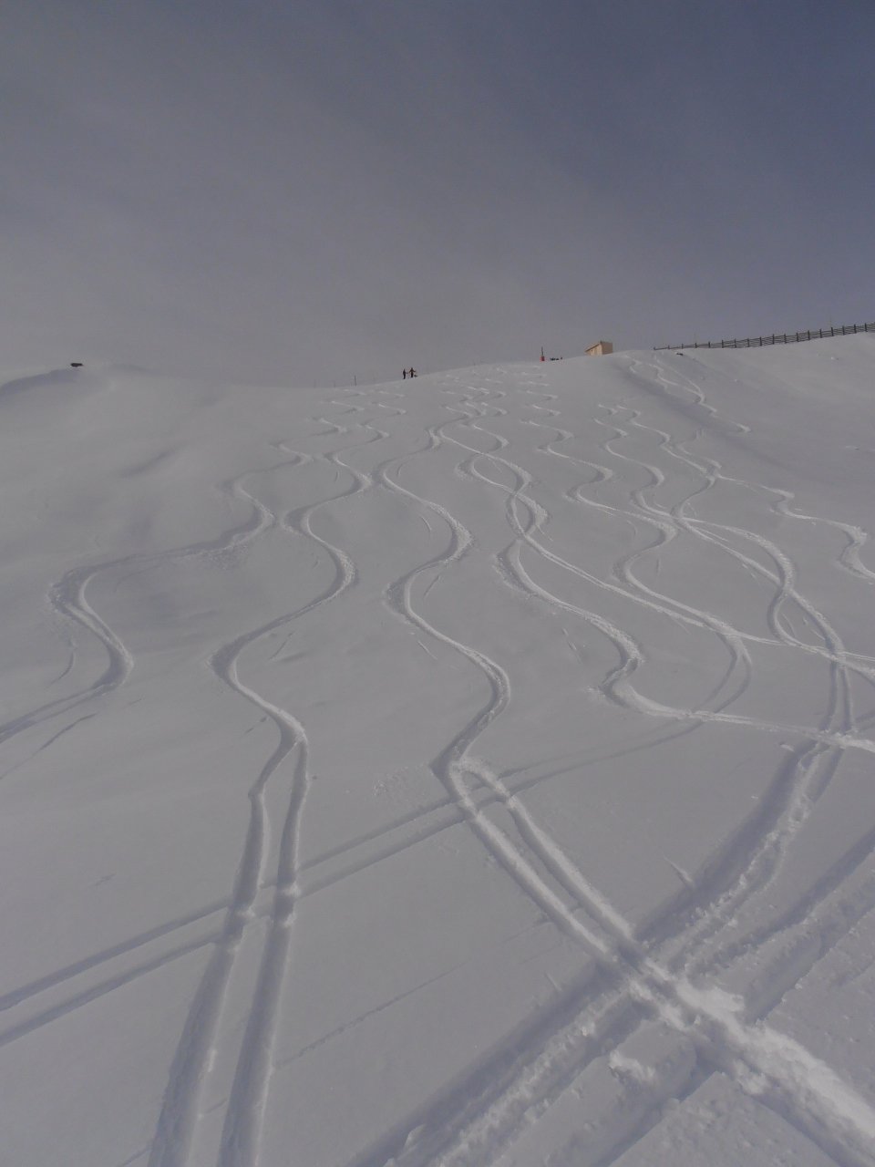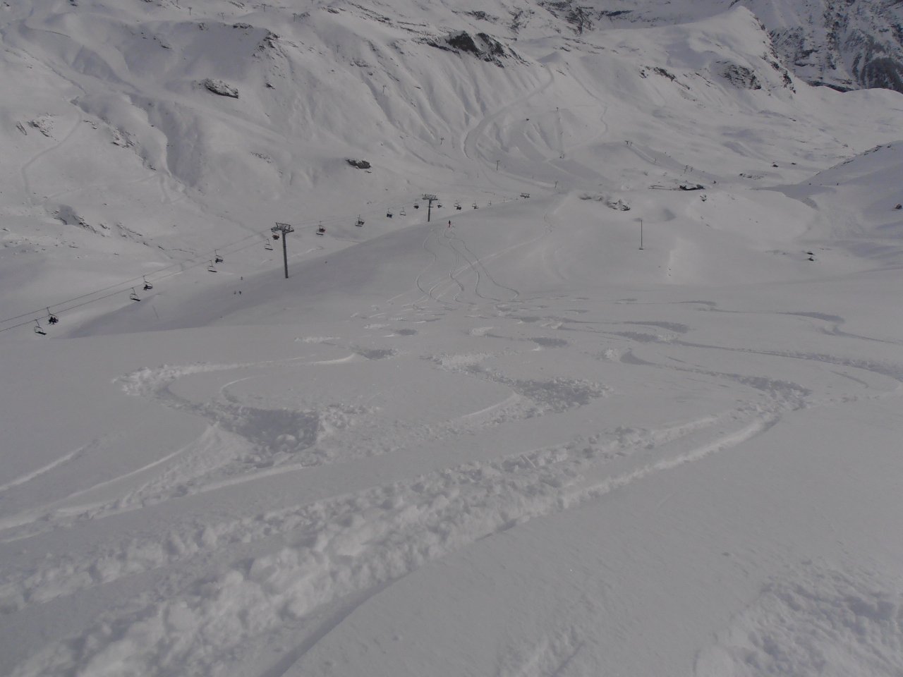 Sul versante est trovati 20-30cm di farina sopra il (poco) fondo. 350 mt di bella discesa, restando comunque leggeri per non toccare. Da lì fino alla base sulle piste innevate artificialmente con neve fresca che scemava fino a 5 cm alla base delle piste. Non male anche se su pista, sicuramente perchè il “nuovo” ti fa ammirare tutte le montagne circostanti.