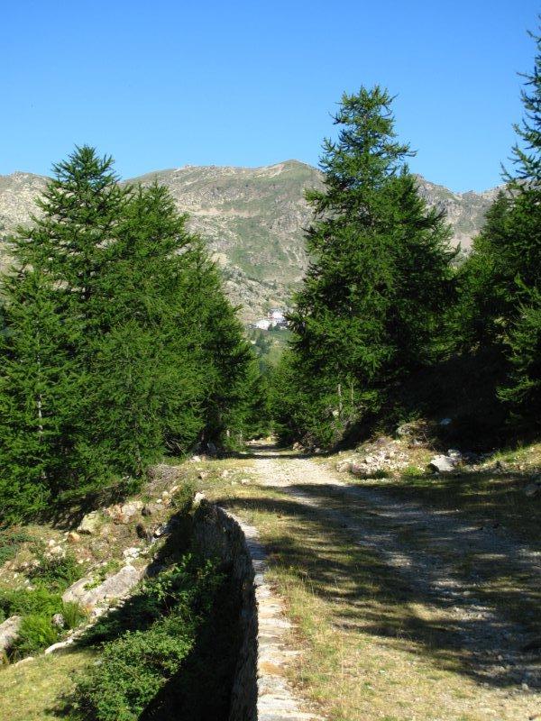 Seguendo il sentiero, dopo circa 45 minuti, si raggiunge il Colle della Lombarda (2351 m, 7 h), dove si intravede il Santuario di S. Anna in direzione nord-ovest: sulla sinistra, volgendo le spalle a Isola 2000, si vede la strada sterrata, in leggerissima salita, che fa da spartiacque italo-francese e che, passando per la Testa di Las Planas (2331m), la Testa Gias del Ciaval (2329 m) e per l’ultima salita di 70 metri (divisa in due tranches) della Cima Moravacciera (2378 m, 8h), porta a S. Anna di Vinadio (2010 m).