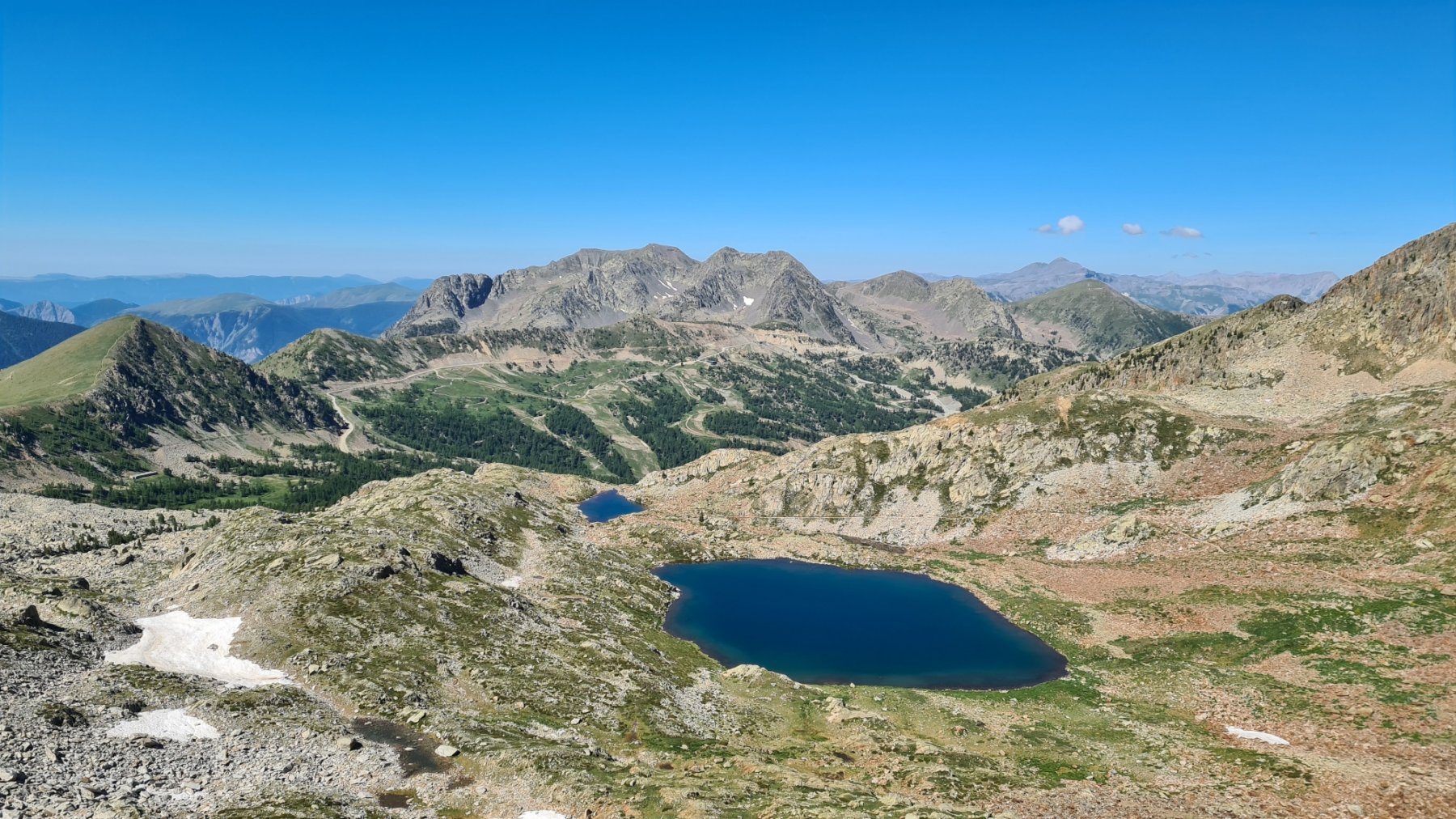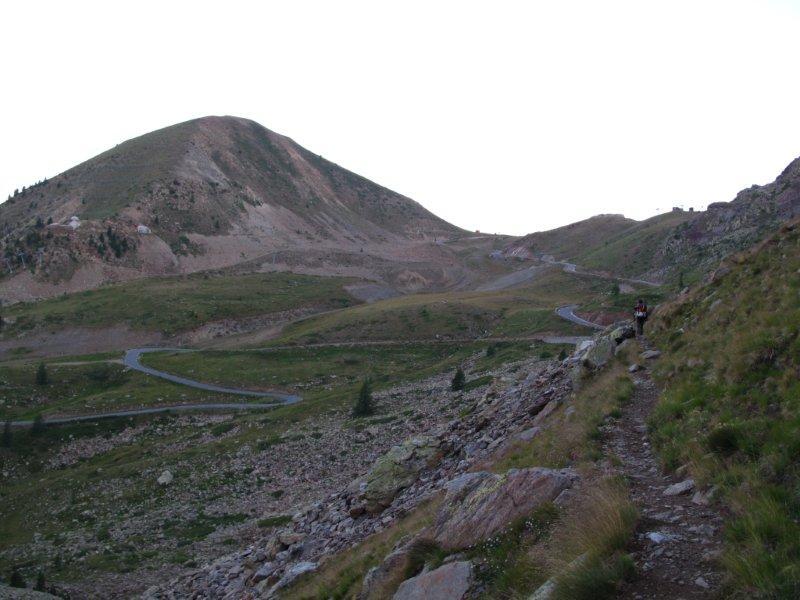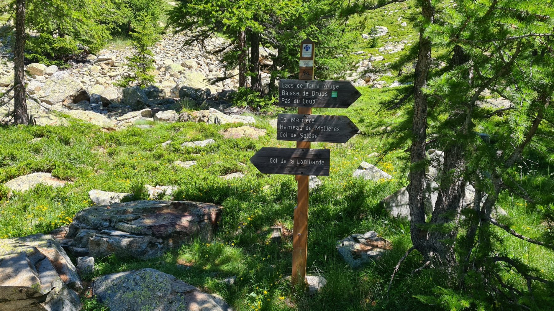 Da qui si scende dolcemente verso Isola 2000 costeggiando i Lacs de Terres Rouges (2452 m), cercando di tenersi sempre sulla destra, direzione nord-ovest, verso il Colle della Lombarda (dovrebbe esserci un sentiero tracciato GTA che rimane più in quota, senza scendere a Isola 2000): se non si trova il sentiero GTA, si può scendere a Isola 2000, quindi si risale lungo il percorso della seggiovia della Combe fino al capolinea e proseguendo ancora per pochi metri si troverà la traccia bianco-rossa (Grande Traversata delle Alpi) e giallo-rossa (Grande Traversèe des Alpes ) sulla destra, a ridosso di una grande pietraia.