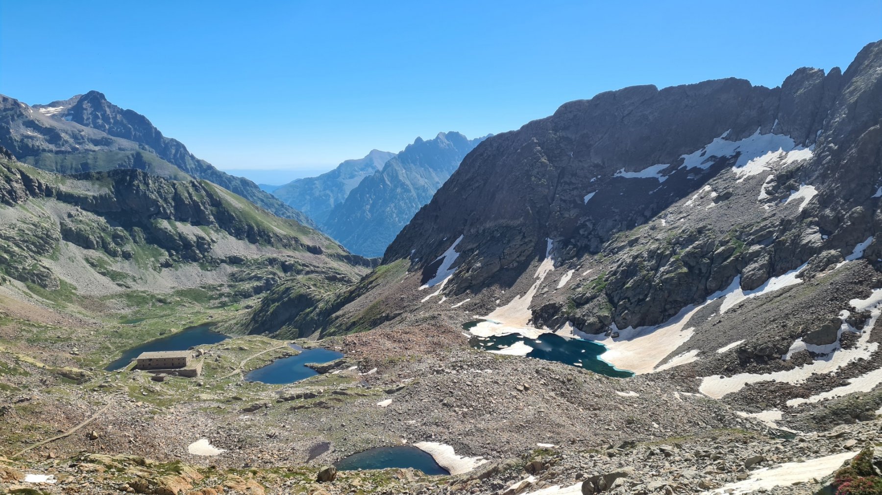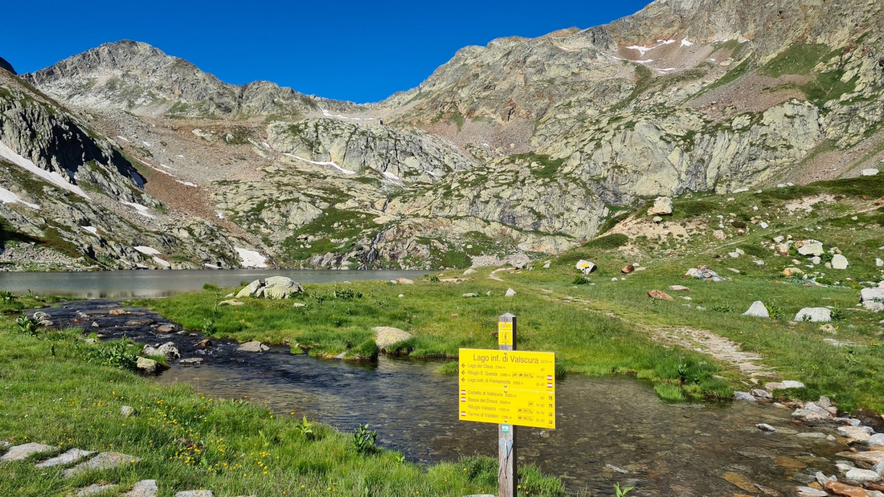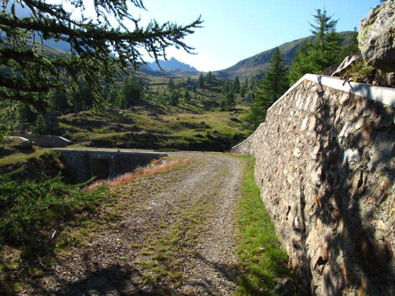 Dal rifugio Questa (2388 m, 3h) si ridiscende per pochi metri verso il Pian del Valasco, fino a vedere sulla sinistra un piccolo sentierino non tracciato che conduce direttamente al Lago del Claus (2344 m), e da qui ai Laghi di Valscura (2274 m, 4h) passando per la bellissima strada militare eretta dal battaglione Ceva, come riportato anche in un’incisione su una pietra di contenimento