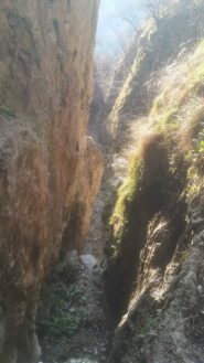 arrivati al Pià ‘lla Löera sulla sinistra scendendo dritti per un breve pendio erboso si ritroviamo un evidente prosciugato letto del ruscello stretto tra due pareti rocciose scendere lungo il canyon secco