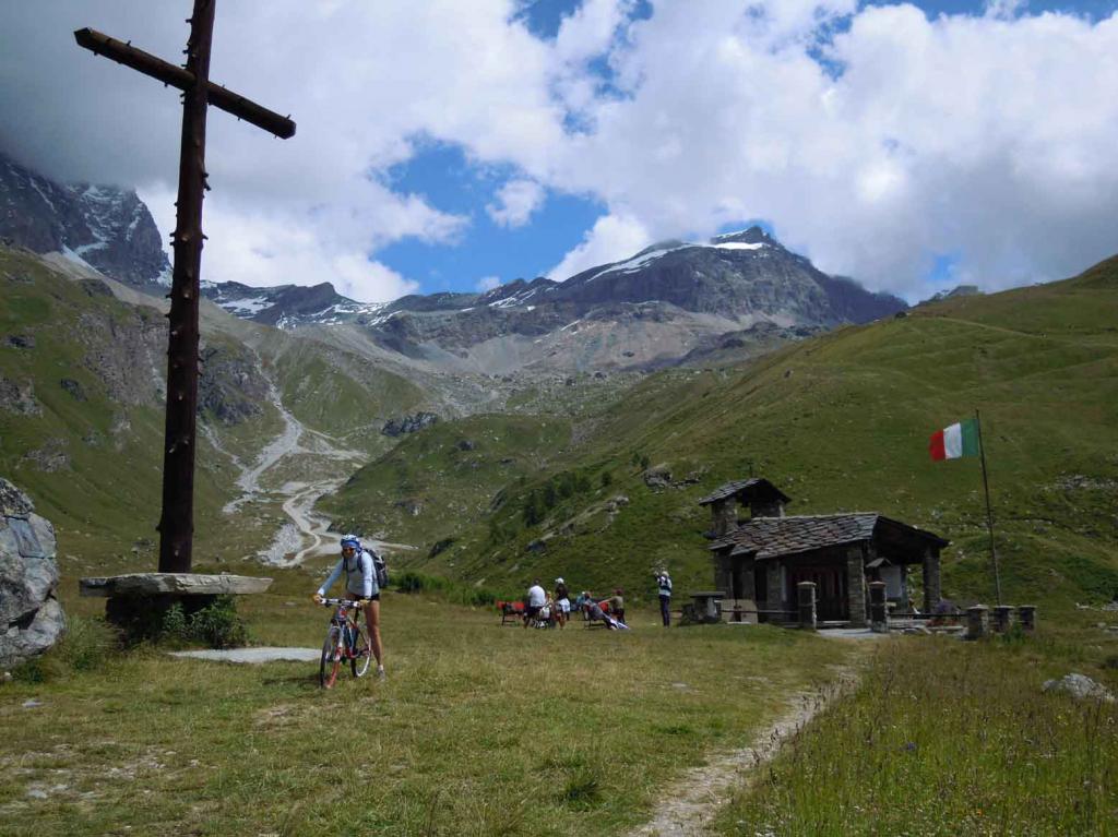 Da Cervinia si attraversa il paese passando accanto prima al campo da golf, e poi giungendo alle ultime case accanto ad un campo da tennis, oltre il quale si nota il cartello per il Rifugio Oriondè. Si inizia a salire la strada sterrata, che poi dopo diventa per alcune centinaia di metri asfaltata, subito con pendenze importanti oltre il 10%. Si raggiunge rapidamente la bella cappella Battaglione Alpini del Monte Cervino posta su un bel promontorio panoramico. Si tralascia la stradina a sinistra e superando la sbarra si continua a salire, pendenza ora moderata, per iniziare una lunga serie di tagliate e tornanti. Si prosegue al 10% per 1 km finchè la strada spiana per un tratto (ingannevole). Si passa nei pressi della bella cascata già visibile da sotto, e poi si riprende a salire più duramente con pendenze ora quasi sempre superiori al 13% (punte del 15 e talvolta 18%, specie nei tornanti). Dopo 2 km molto duri e senza tregua, si giunge nella parte centrale del percorso dove qualche breve tratto permette di rifiatare, godendo della bella vista su Cervino e Grandes Murailles. Il Rifugio è ben visibile guardando in alto. Si riprende quindi la salita, sempre dura, superando alcuni brevi tratti asfaltati (2013) per evitare che il disgelo eroda la sterrata. Si giunge nei pressi di un fabbricato e si prosegue sulle ultime rampe, che non mollano mai, fino a giungere al Rifugio Duca degli Abruzzi. E’ ancora possibile salire sulla spianata sovrastante in sella. Da qui per chi volesse, in 15-20′ si può salire a piedi alla Croce Carrel 2920 m, posta su uno speroncino roccioso.