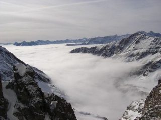 Avventura con Angelo, Chiara e Max.Sino al Lago Chiaretto il paesaggio è, ai nostri occhi, alquanto desolante e repulsivo (pietre e solo pietre, nuvole grigie basse). Poi raggiunto il conoide, la via dinanzi si fa più erta, la neve finalmente appare ed è splendidamente farinosa, appoggiata ad un fondo portante. il canale diventa via via più ripido, restringendosi, ed infine balza nel cielo azzurro dove non resta che scorgere il limite breve dell’infinito e prepararsi per una discesa fantastica.