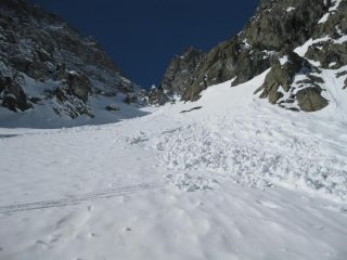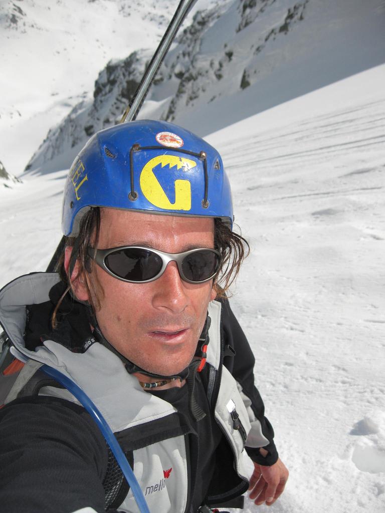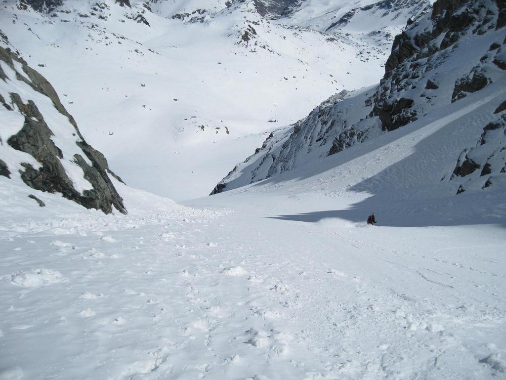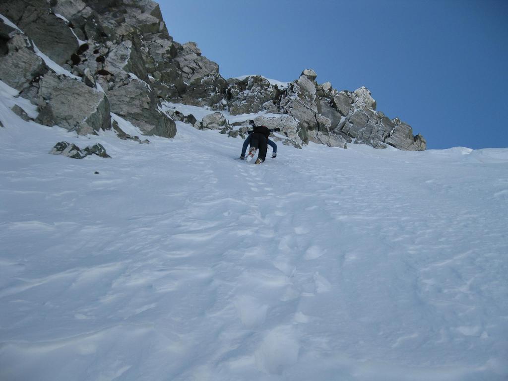 Canale ancora bello carico , salito quasi integralmente con i ramponi, neve strana di diversa consistenza , evidente il distacco e la frattura di due settimane fà.. Ma poco sotto il passo abbiamo pensato bene di non tagliare l’accumulo che si è formato sotto la cornice,il vento soffia verso il basso del canale… Giù qualche metro faccia a monte e calziamo gli sci ! Viia col vento ! Bellissima discesa dopo la curva del canale… In compagnia del Grande Giova