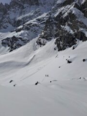 Molte molte scariche dai pendii esposti a sud ed est… tentiamo una ripellata verso il Giacoletti ma le scariche sono troppe e troppo grosse, e ritorniamo al pian della regina in una polenta liquida, valutare bene bene gli orari e i pendii sopra la testa