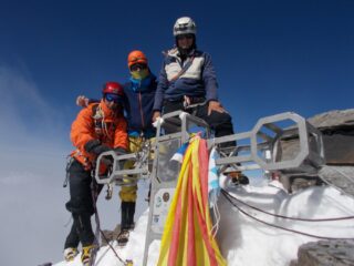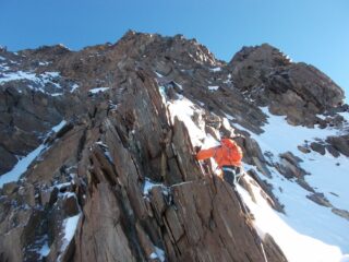 Dal Giordano al Balmenhorn in 10 cm di fresca della notte precedente all’attacco tutto da battere. Poco il tempo per acclimatarsi adeguatamente. Gli impianti se da un lato aiutano, per altri versi devastano. Ma il tempo per fare le cose con calma come una volta ai giorni nostri, abituati ormai a una vita sempre piu’ frenetica, non c’e’ piu’. Una linea perfetta, che conserva tutto il suo fascino di sempre, anche a ormai 33 anni di distanza dalla prima ascensione solitaria. Molta neve in cresta ma con rigelo ottimo, malgrado ad oggi e la roccia a prevalere rispetto ad allora, quando i ghiacciai all’epoca di roccia ne lasciavano affiorare porzioni ben piu’ ridotte. Il meteo anche stavolta dalla nostra parte, ci ha consentito di portare a termine in sicurezza e con gran soddisfazione quest’impresa dio tutto rispetto fin sul tetto della seconda montagna piu’ alta d’Europa, per una via tutto sommato non banale in ambiente severo, dove e’ meglio non farsi sorprendere dal maltempo. Quindi occhio..ben allenati..ben acclimatati e ottime capacita’ a muoversi in terreni che richiedono un abbondante sforzo fisico ,e una buona tenuta nel tempo. Viste le tante ore di permanenza in quota, all’istante ecco che tutto diventa piu’ difficile, anche il semplice scatto di una foto puo’ diventare problematico in certe situazioni.