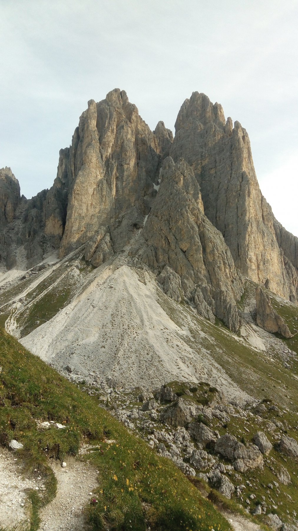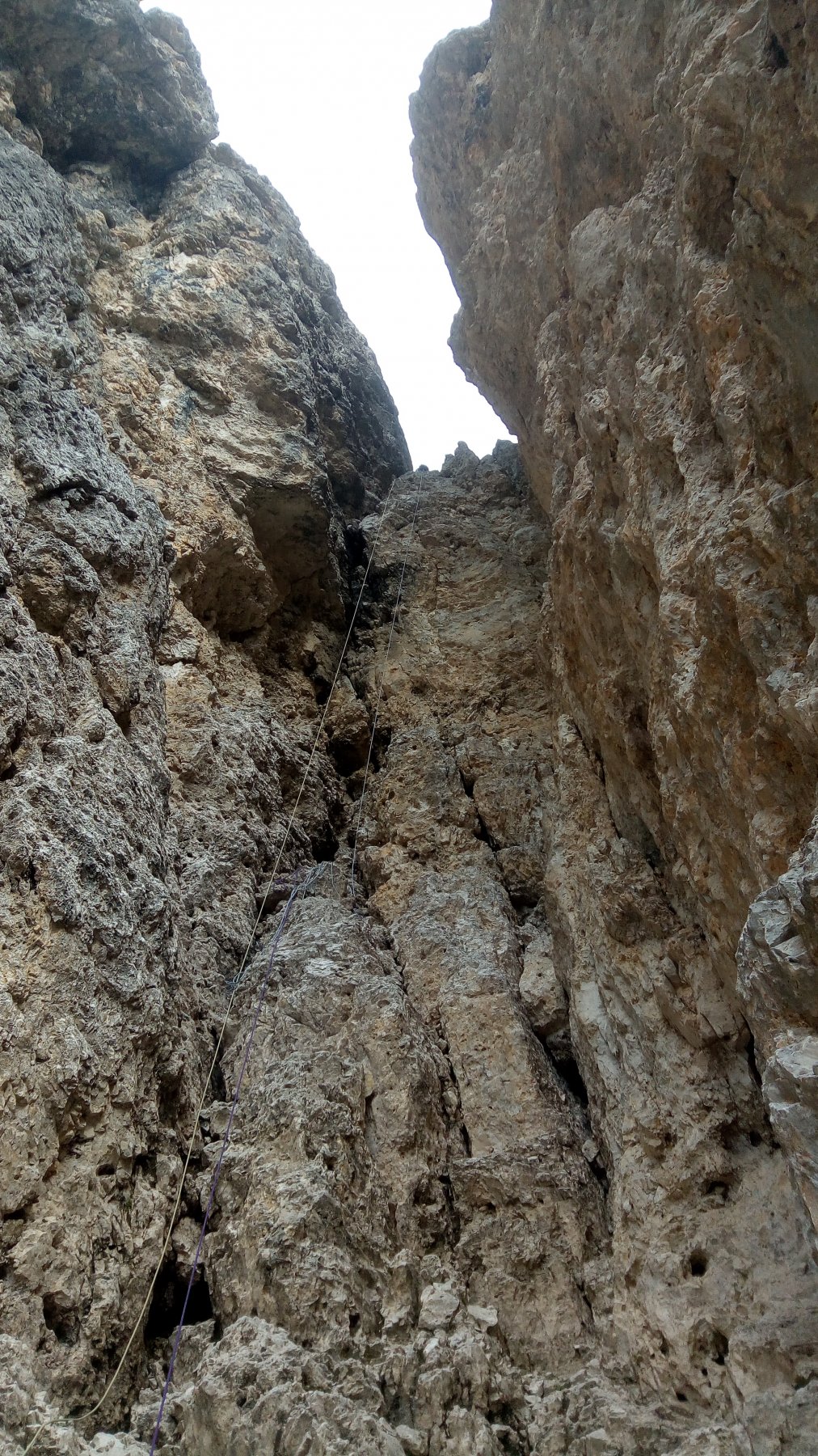 L2: 50 m, salire verso un diedro giallastro a sinistra, superarlo (V-, passo chiave, ch.) e traversare in obliquo a sinistra (non salire un’ulteriore breve fessura-diedro giallastra, possibile ma più difficile, V/V+) per terrazzini e ripiani esposti (III/IV) fino quasi allo spigolo