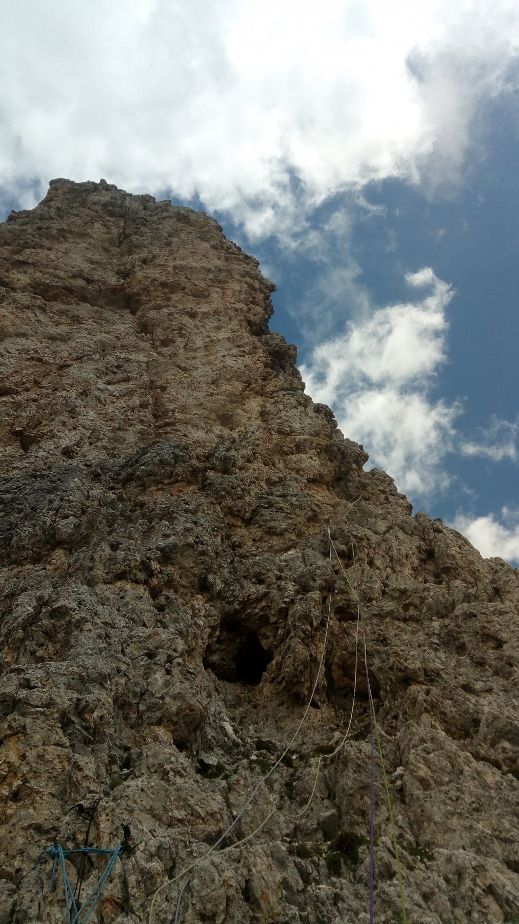 Doppia 1, 55 m: calarsi verso la forcella a nord del campanile (molto aerea, in parte nel vuoto), sosta successiva sulla parete di fronte