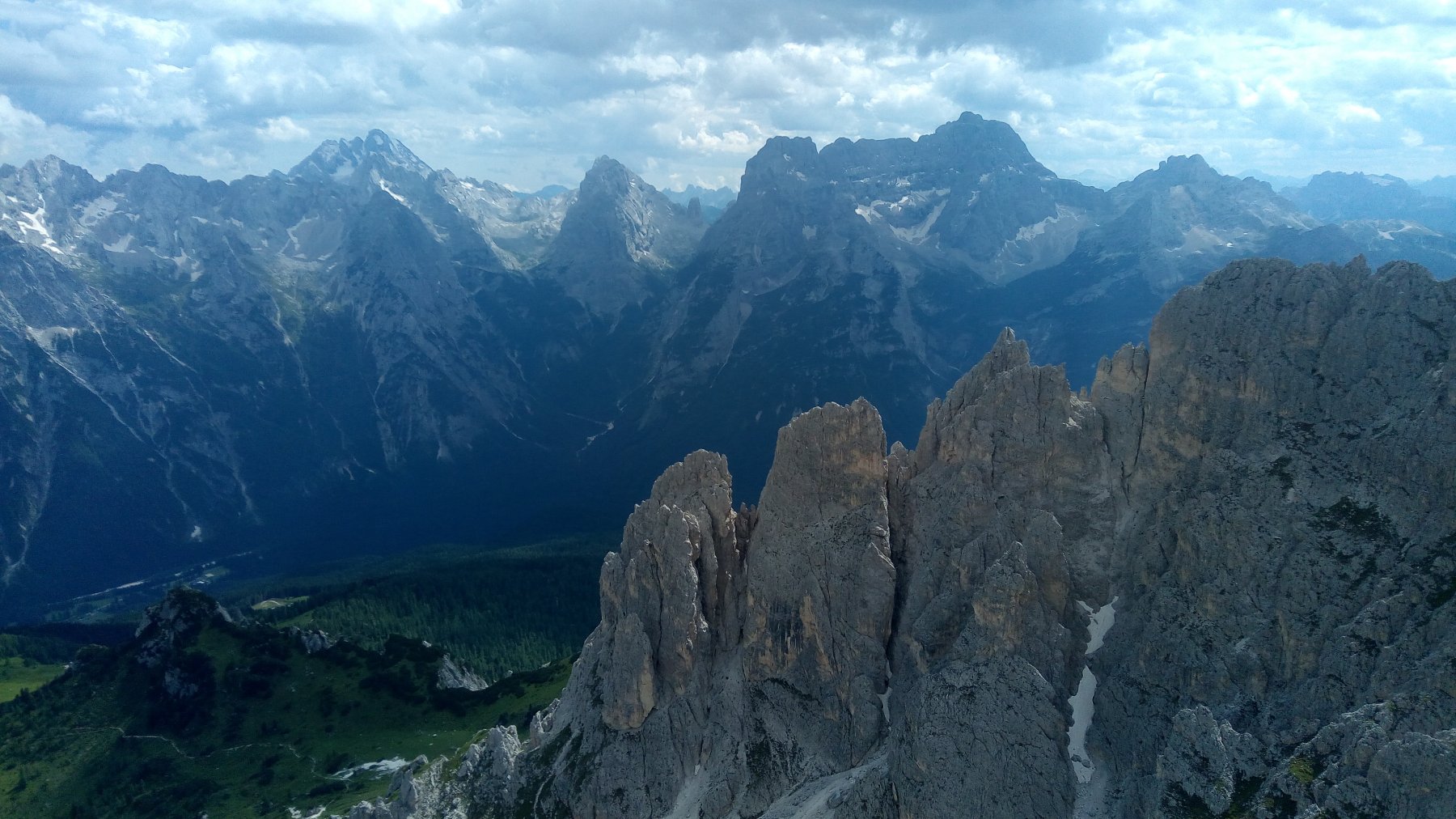 dalla vetta scendere assicurati (II, esposto) per 5-6 m dalla parte opposta rispetto alla salita, un po’ verso destra faccia a valle, fino alla sosta catena.