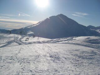 Visto il pericolo valanghe in giro, oggi gita tranquilla a bordo piste. Partito presto x evitare la ressa…8.30 sulla cima a godermi un panorama favoloso. Discesa sulla sella Bauzano per fare un bell’anello.