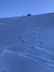 La neve ha subito il lavoro del caldo e del vento e le parti ancora molto belle sono rimaste quelle in pieno nord nella parte mediana del percorso sui pendii delle piste, ( fortunatamente ancora chiuse )