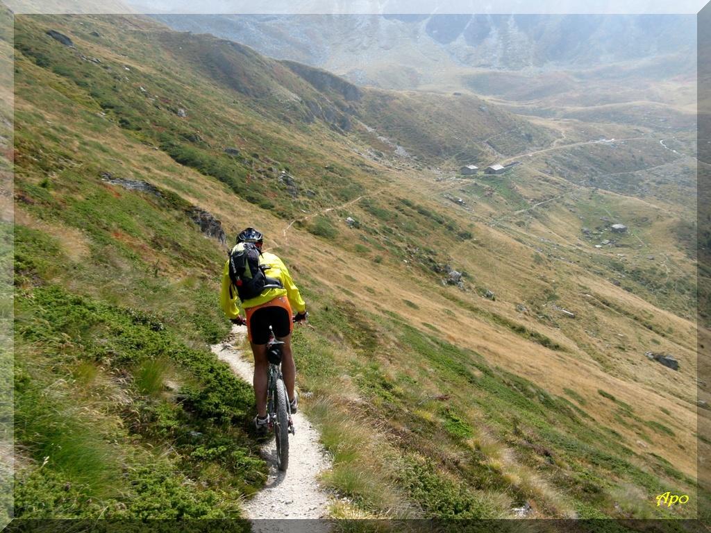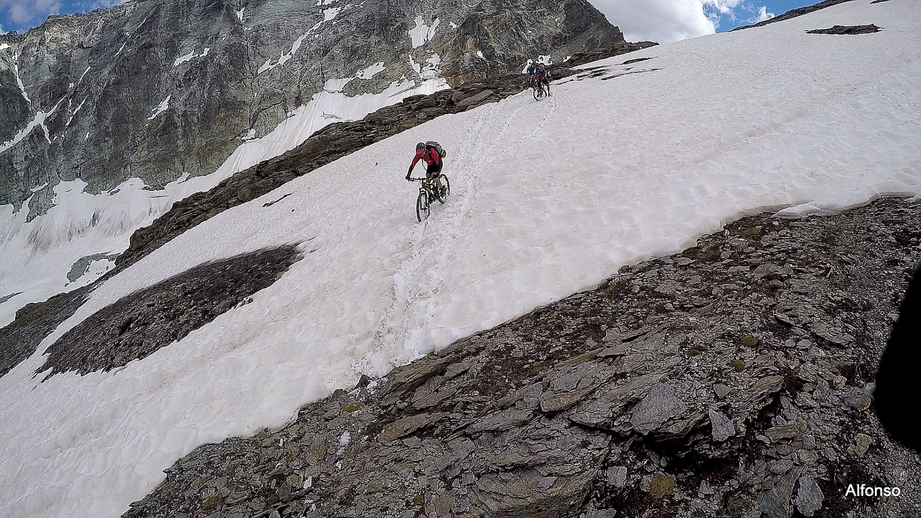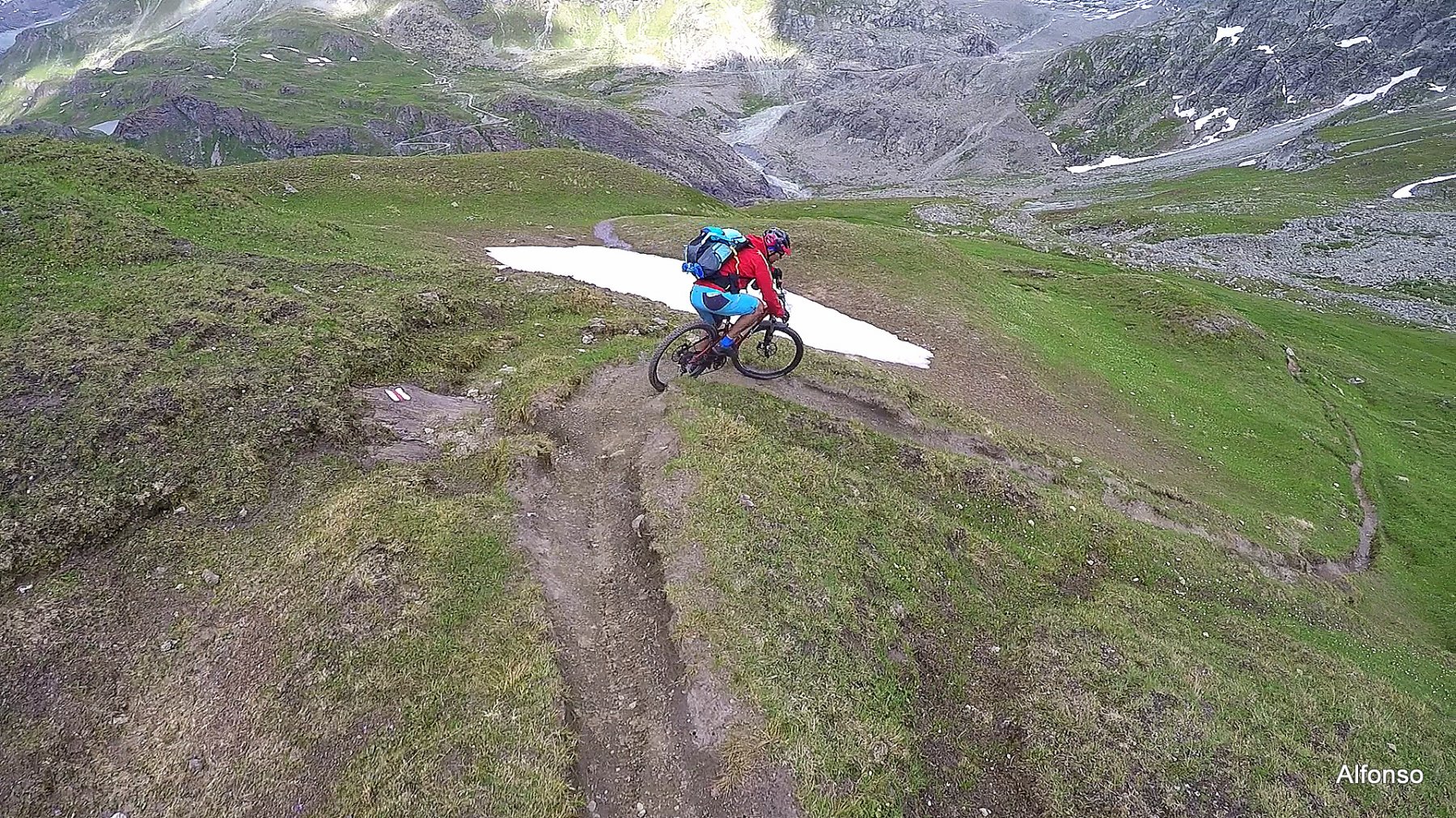 Tratti ripidi, non ciclabilita’ ,ancora nevai.Dalla Fenetre scendere stando sempre sul sentiero TDC(50% ciclabile) fino alle grange Gran Charmontane a 2255mt..