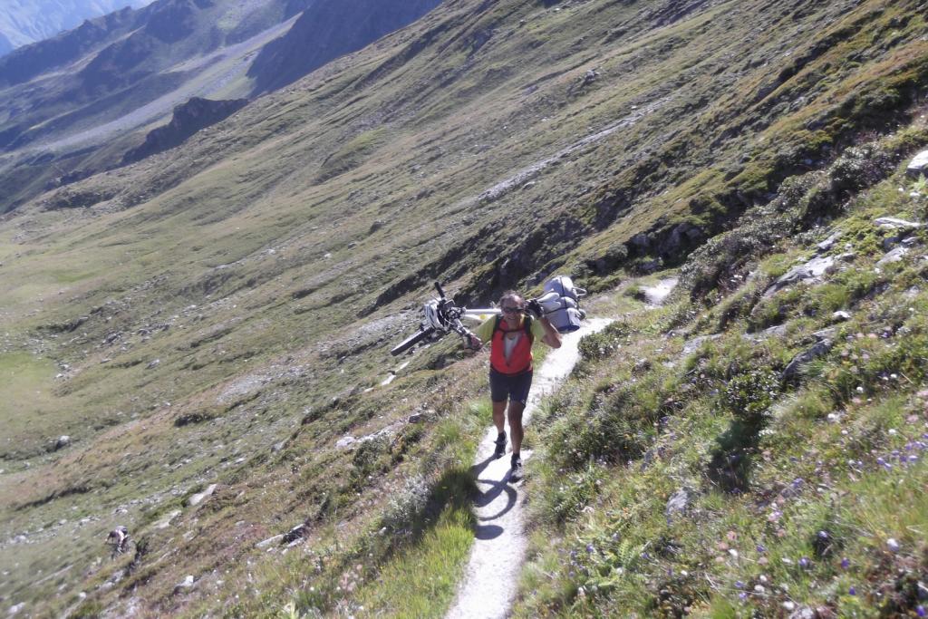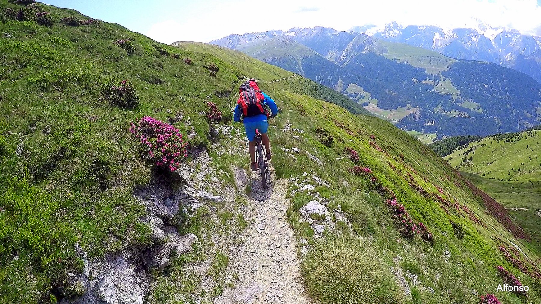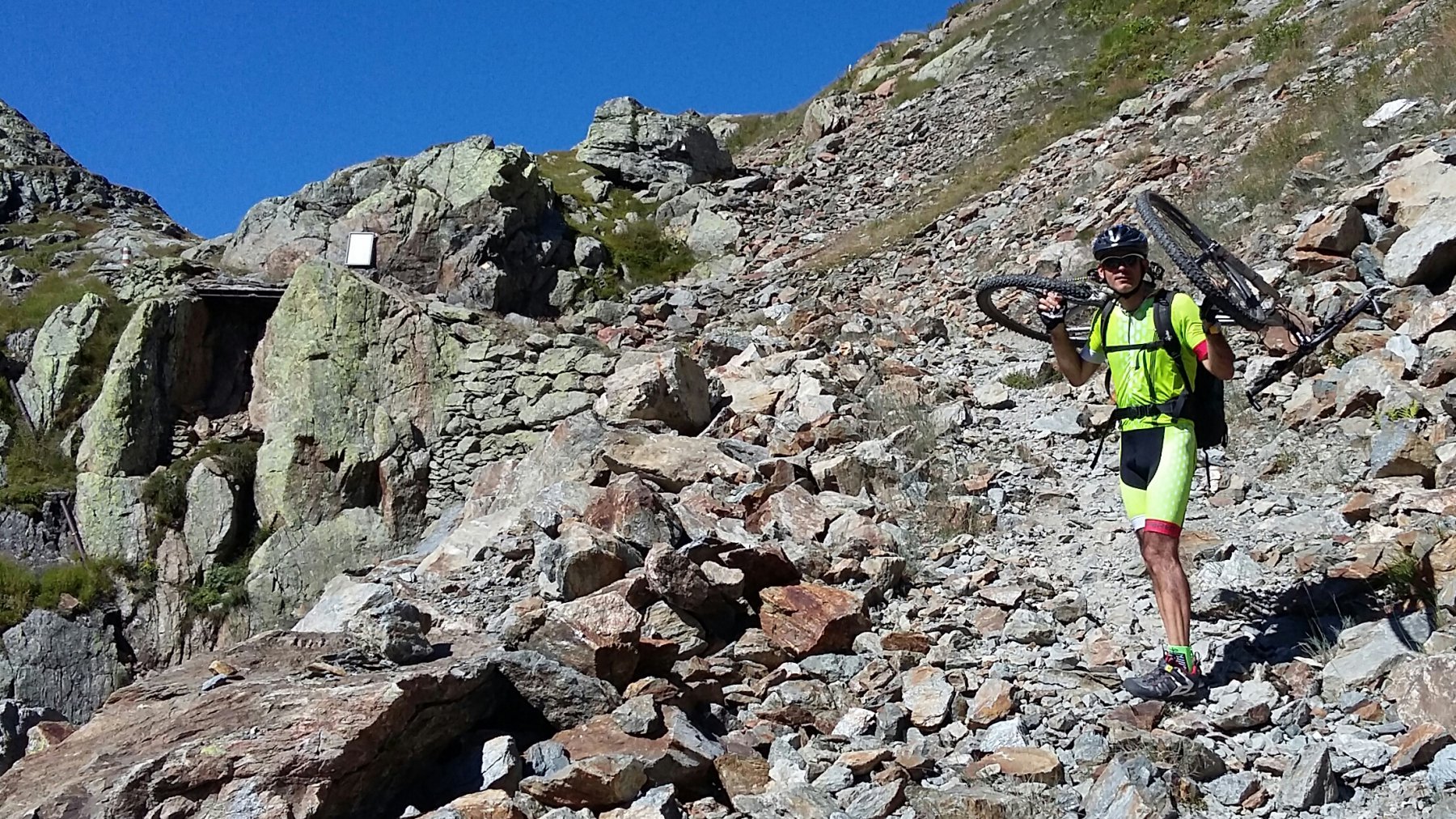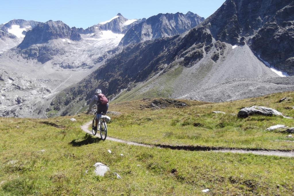 Tratti ripidi, non ciclabilita’ ,ancora nevai.Dalla Fenetre scendere stando sempre sul sentiero TDC(50% ciclabile) fino alle grange Gran Charmontane a 2255mt..