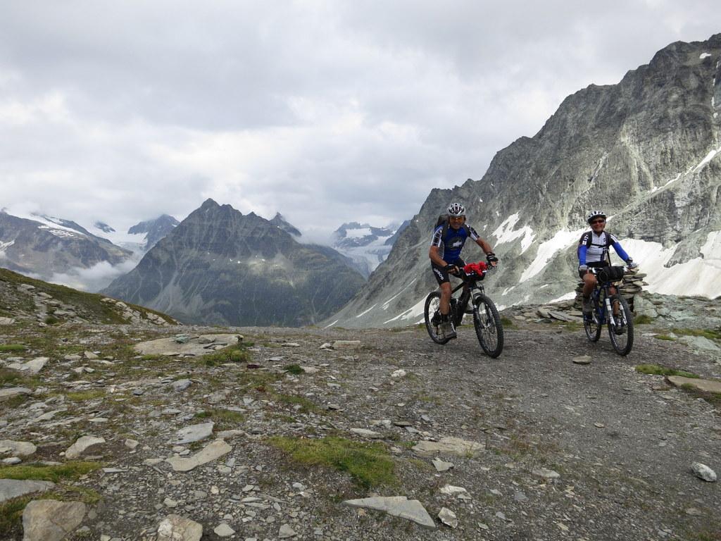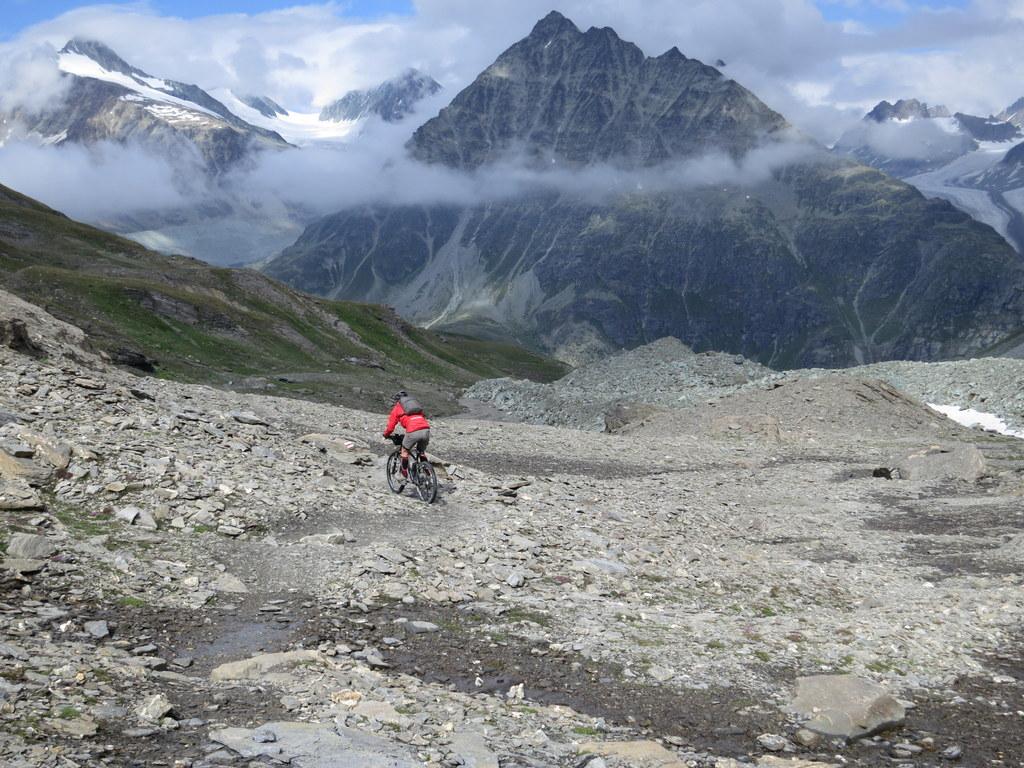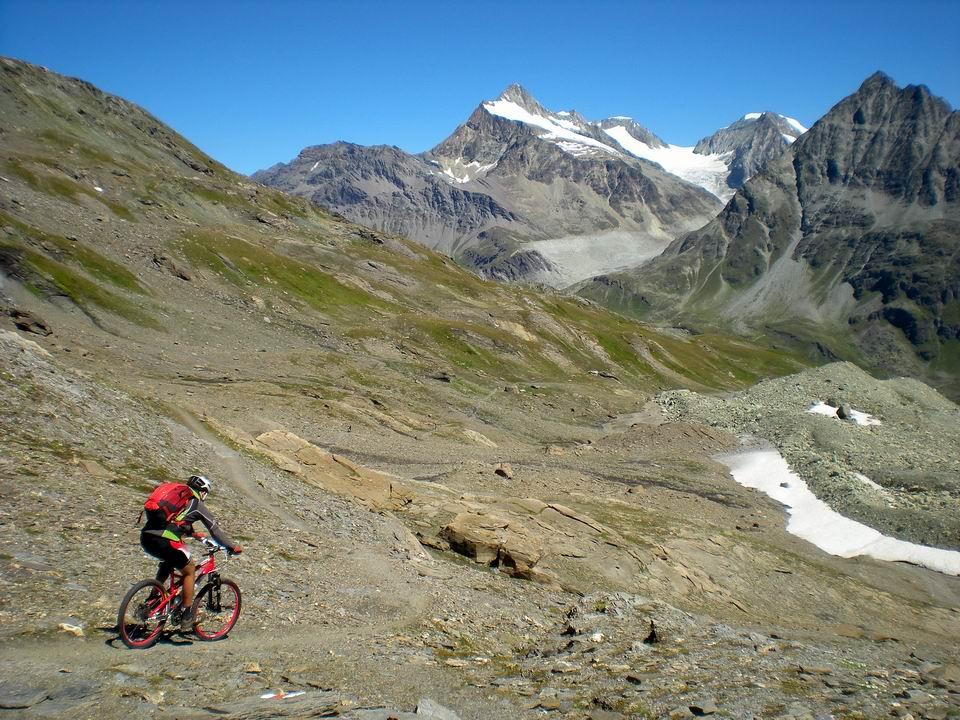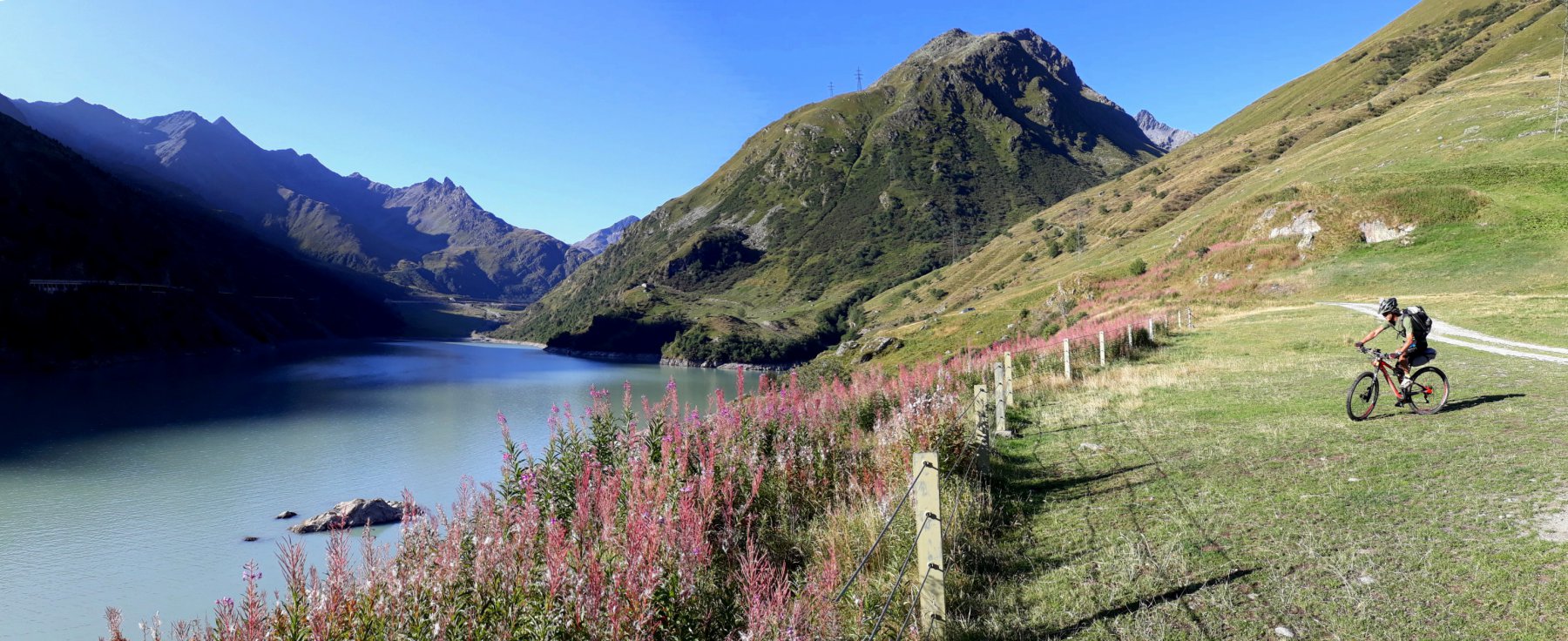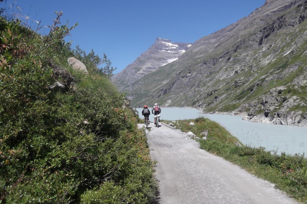 Proseguire fino alle baite Sur le Four.Proseguire sempre in sella fino al fondo del lago , attraversare un ponticello e ,a piedi, salire sul piazzale degli impianti di risalita del Gran S, Bernard. Qui seguire fedelmente i 6 km di statale fino al mitico Colle del Gran San Brnardo.