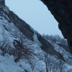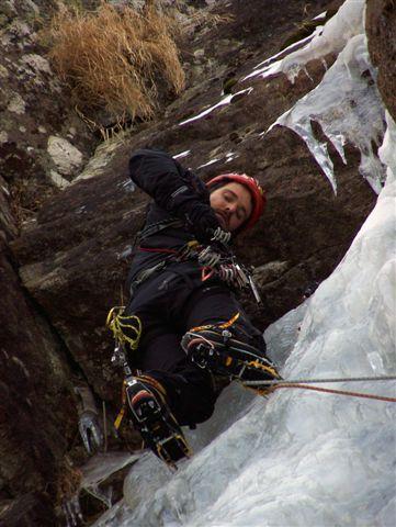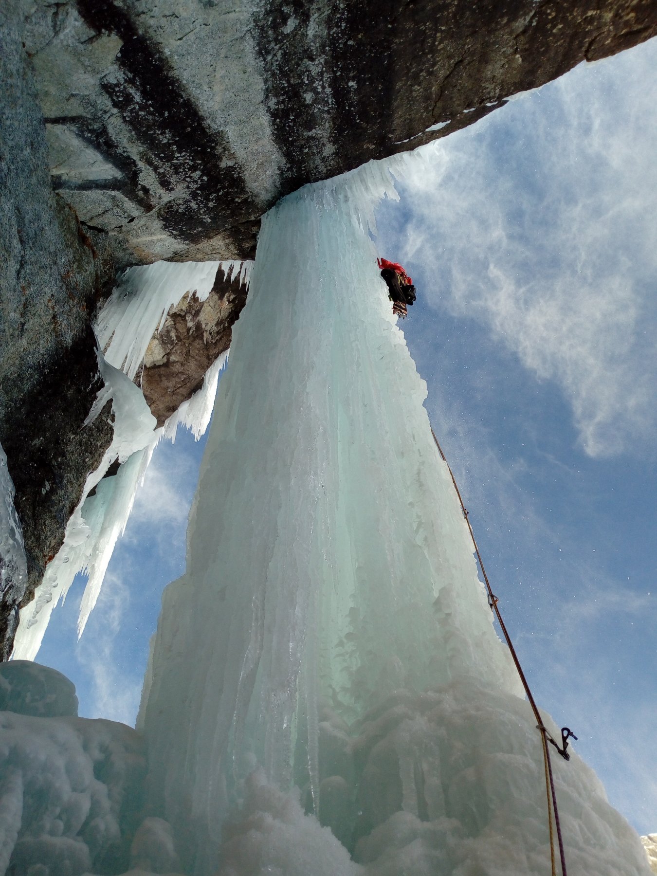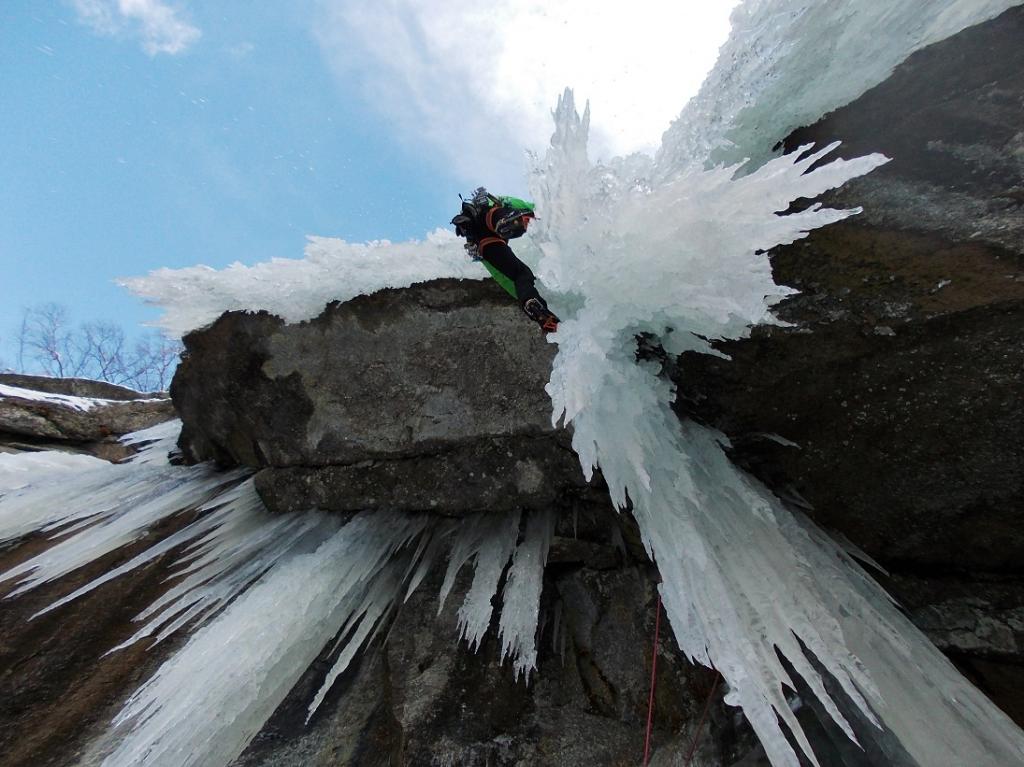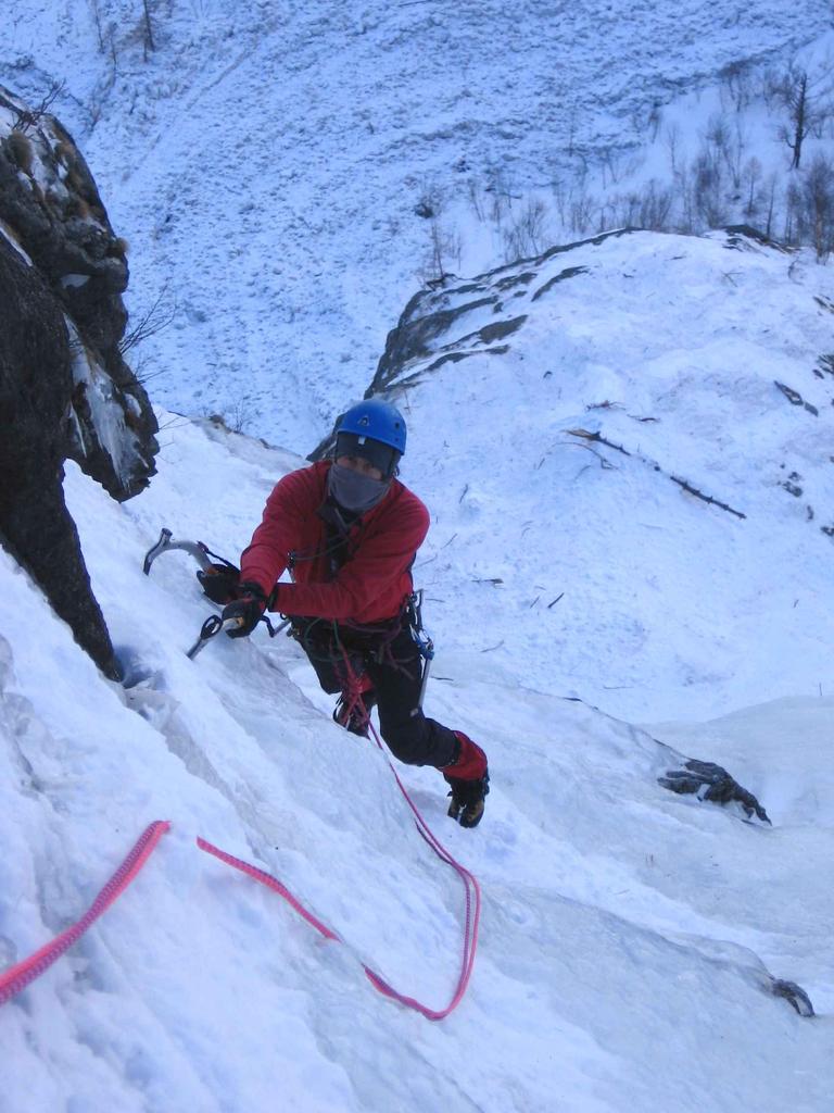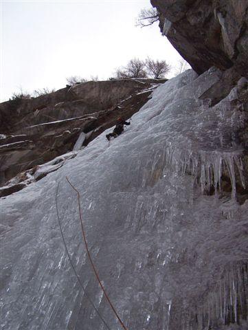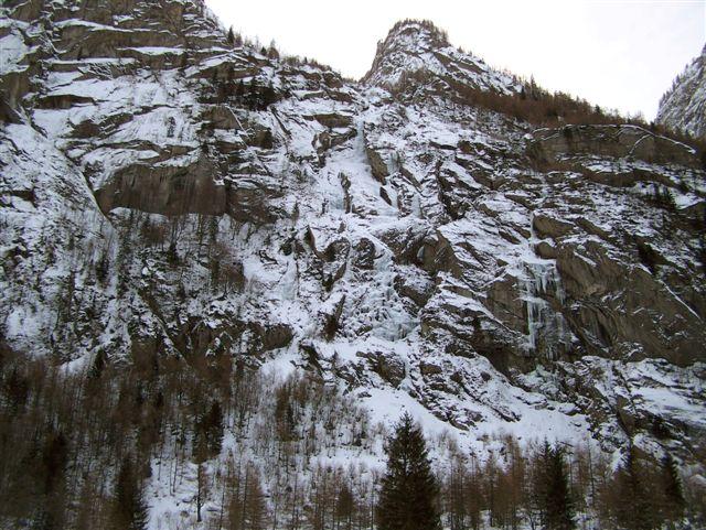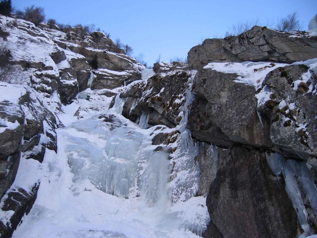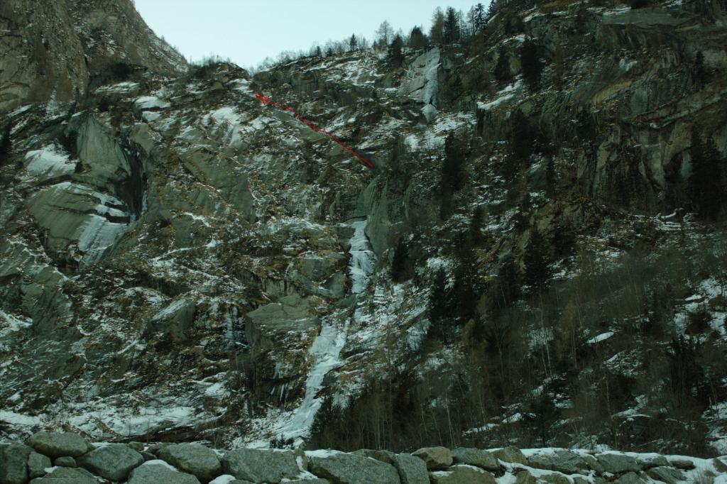 Attaccare la cascata seguendo un canalino sul lato dx sino a raggiungere la base di un salto verticale. (80° max) Il salto successivo si può superare in più punti. Salire diritti il muro 85° poi seguire vari muretti 75° e una breve salto/paretina 80° sino a sostare alla base del muro successivo. superare lo stesso nel centro qualche metro a 90° poi in obliquo a dx 80° poi 75° per ritornare a sx dove si sosta a fine corda. traversare in obliquo a sx sino a raggiungere un canalino che si segue sino ad un ripiano di roccette. (questo tiro attualmente è quasi privo di ghiaccio si sale su terreno misto facile) seguire il flusso successivo con due tiri di corda max 75° sino a raggiungere la cascata terminale che si supera con due tiri 75°/85°. seguire per circa 250 mt il facile canale intervallato da brevi salti ghiacciatissimo a raggiungere il sentiero della Val Mezzola.