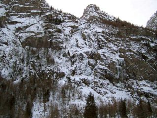Salito il ramo di sinistra. Le condizioni non proprio sono ottimali e, soprattutto sul tiro finale, occorre stare all’okkio, perché il ghiaccio è in gran parte staccato dalla roccia e sotto corre molta acqua.