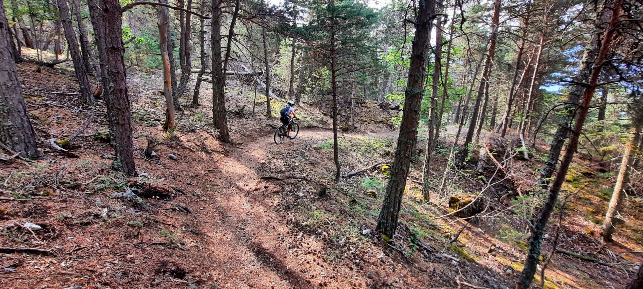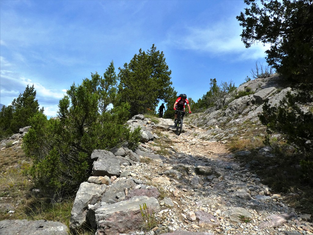 Da Les Guions tra le case inizia un magnifico single track (sentier des Thurifères) che in ambiente particolare ed arido scende a Saint Crepin.