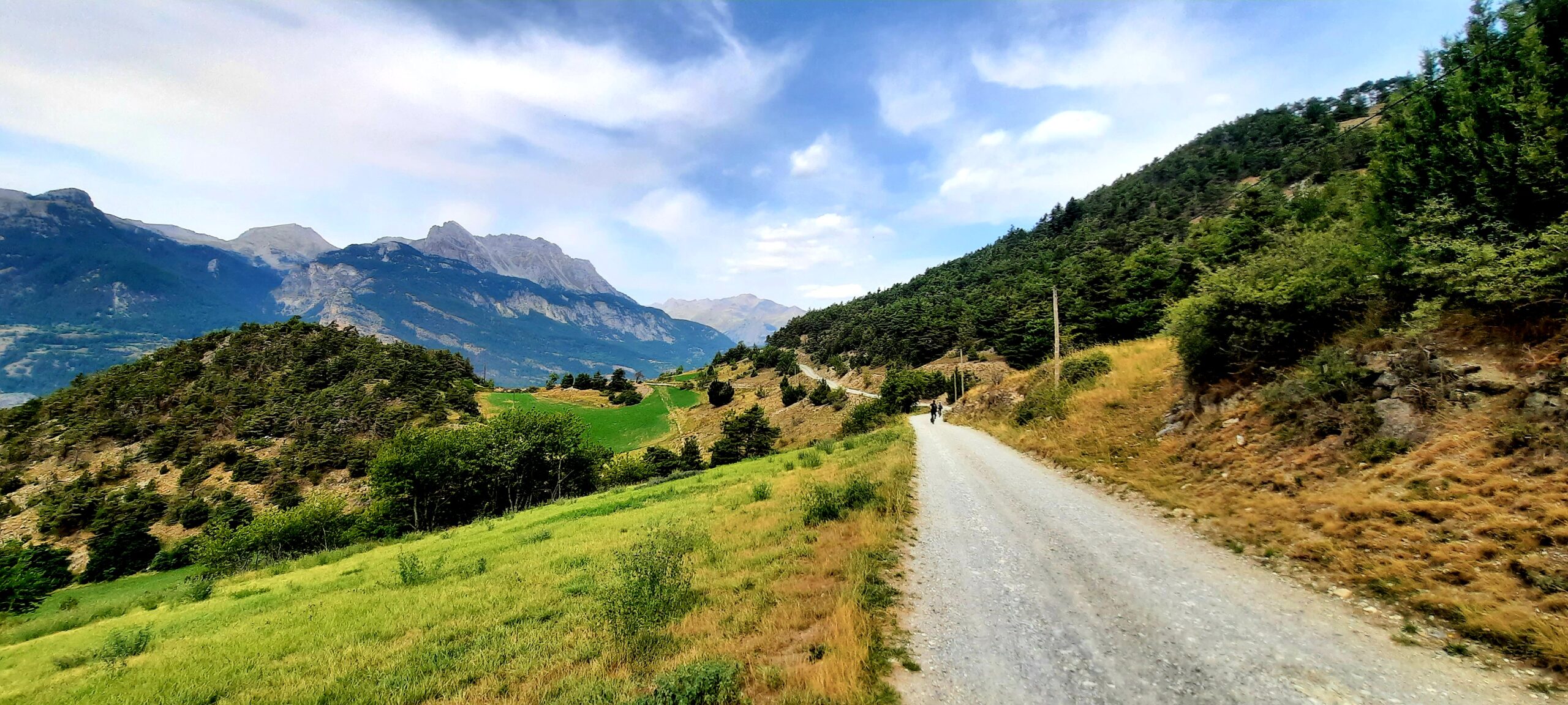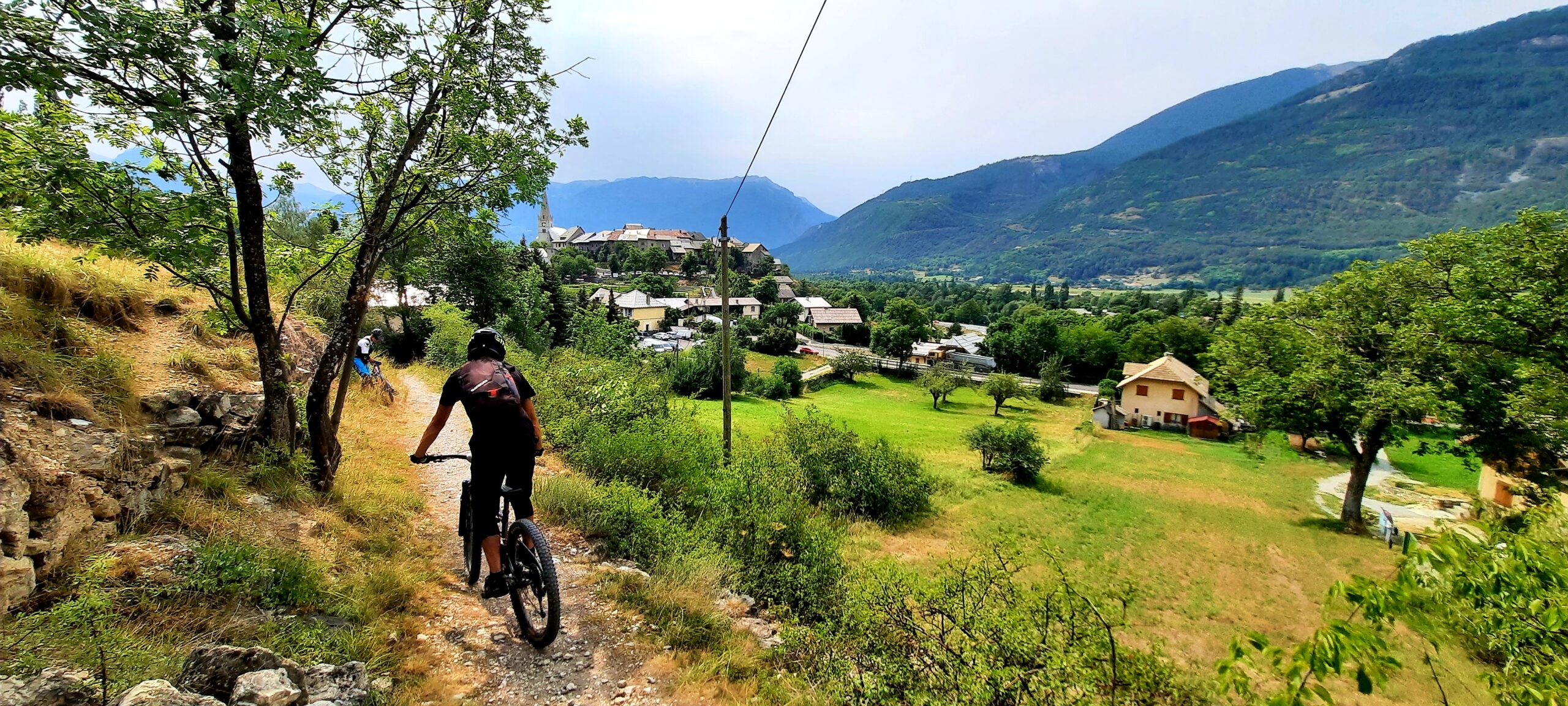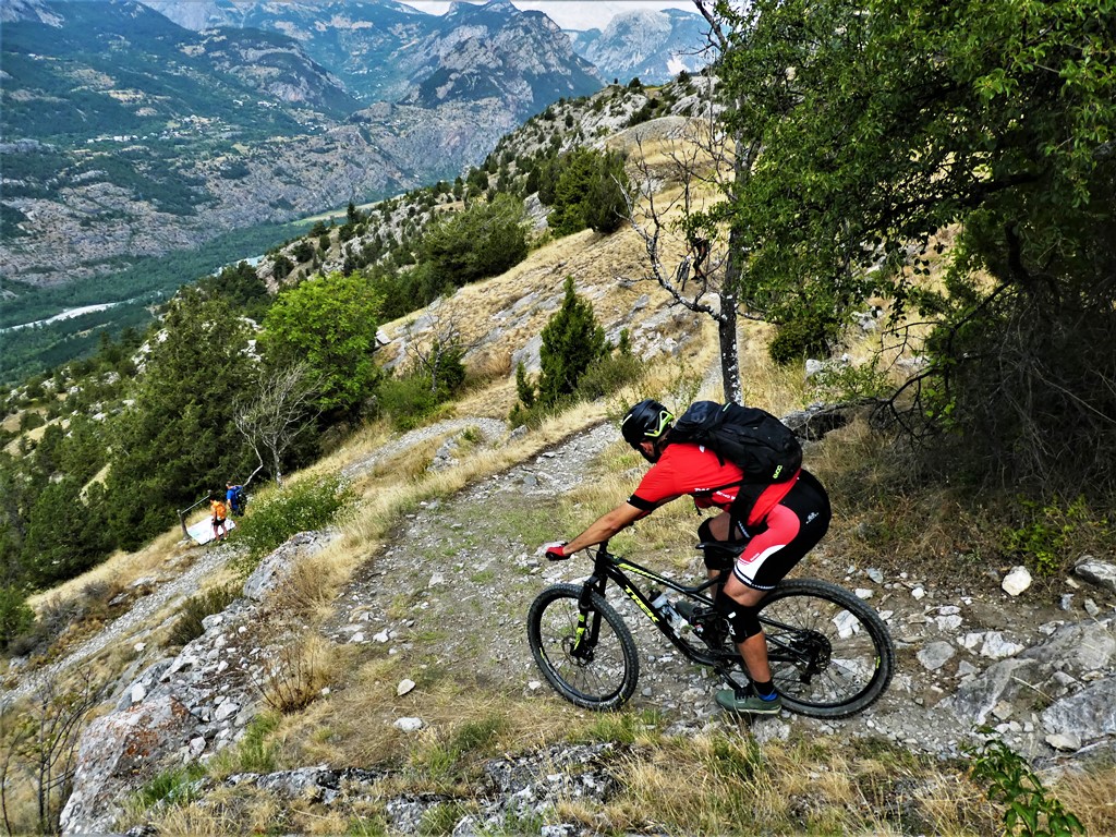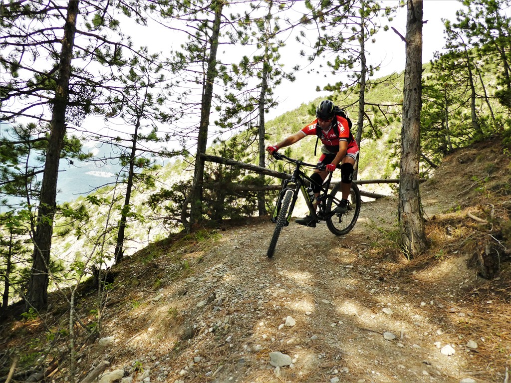 Da qui si scende a sx per il single track che arriva dal col de Moussiere giusto nel tratto più bello e filante della discesa. Non mancano comunque tornanti e tratti tecnici. In corrispondenza del torrente Merdanel lo si deve attraversare seguendo le balise dei percorsi mtb ed in prevalente salita si arriva sulla strada asfaltata che da Saint Crépin sale a Le Villard passando per Villaron.